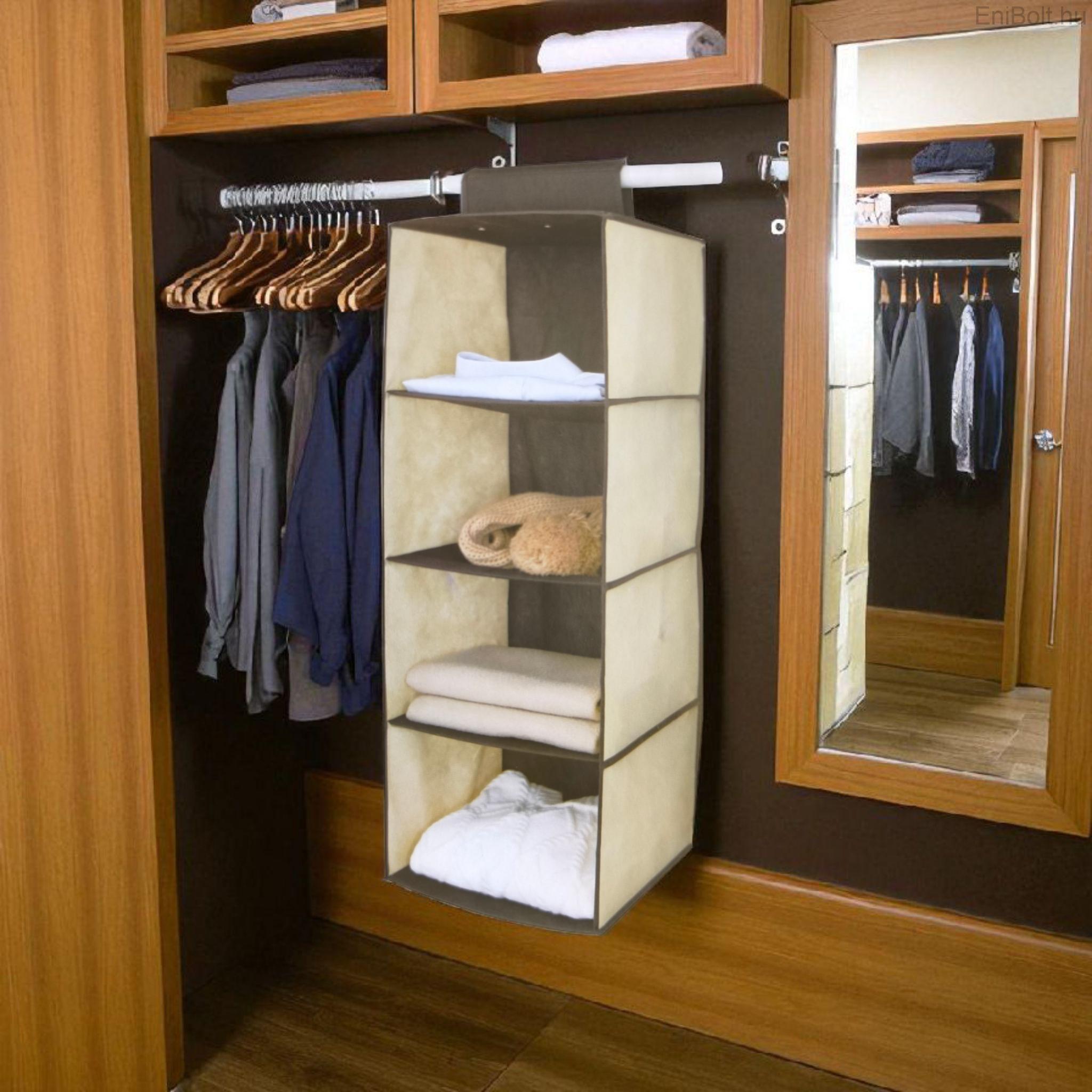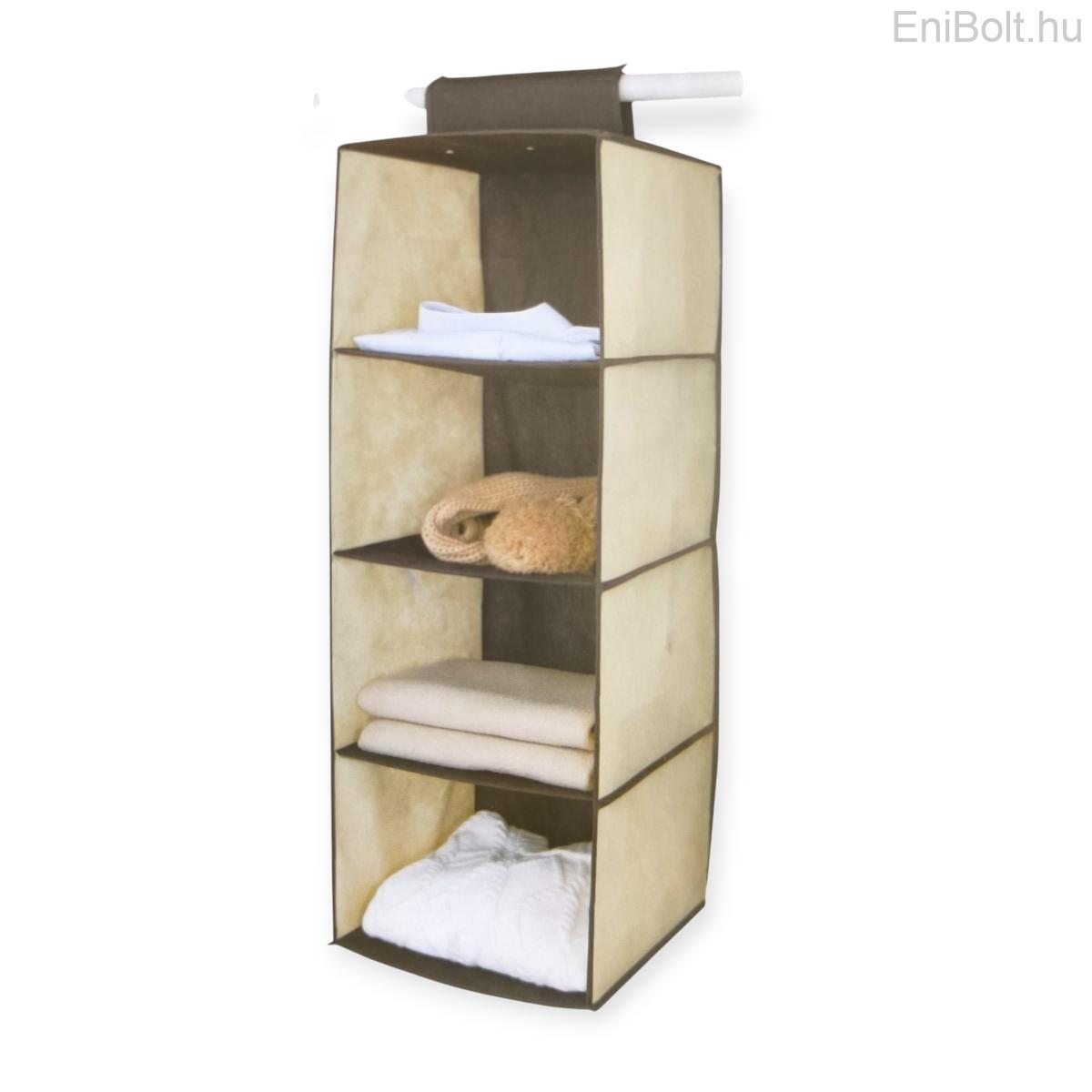 Praktikus és helytakarékos megoldás a ruhák rendszerezésére! Ez a 4 szintes, függeszthető tárolópolc kiválóan alkalmas szekrénybe akasztva való használatra. Ekrü színű, szellőző anyaga megakadályozza a penészedést és ellenáll a nedvességnek. Tökéletes választás kisebb lakásokba vagy gardróbokba.
