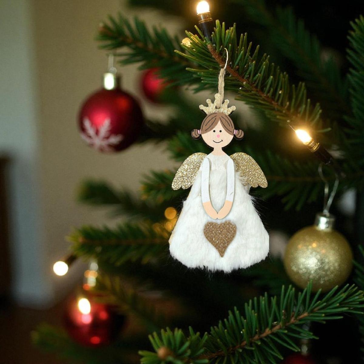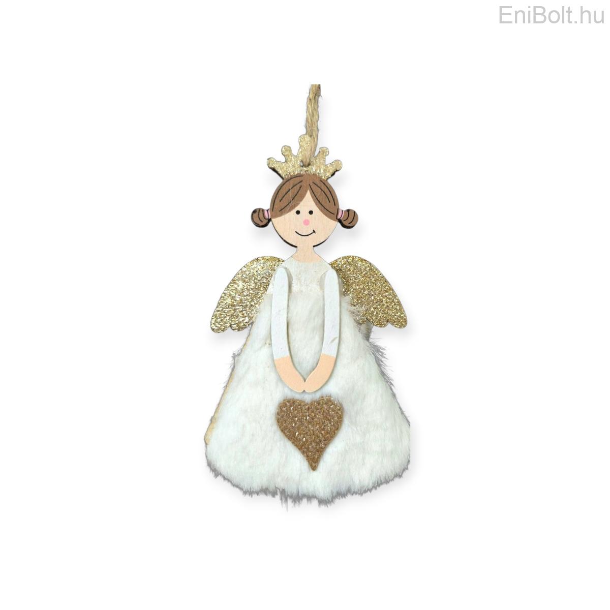 Kezdőlap » Karácsonyi dekorációk » Fából készült díszek » Angyal karácsonyfa dísz – fehér szőrös szívvel, 14 cm