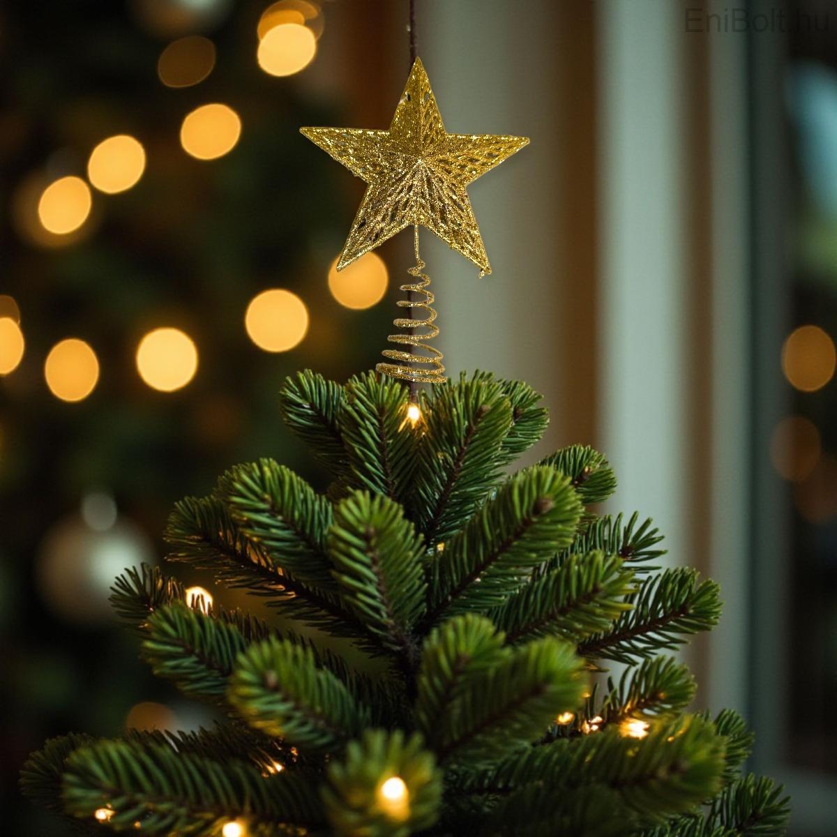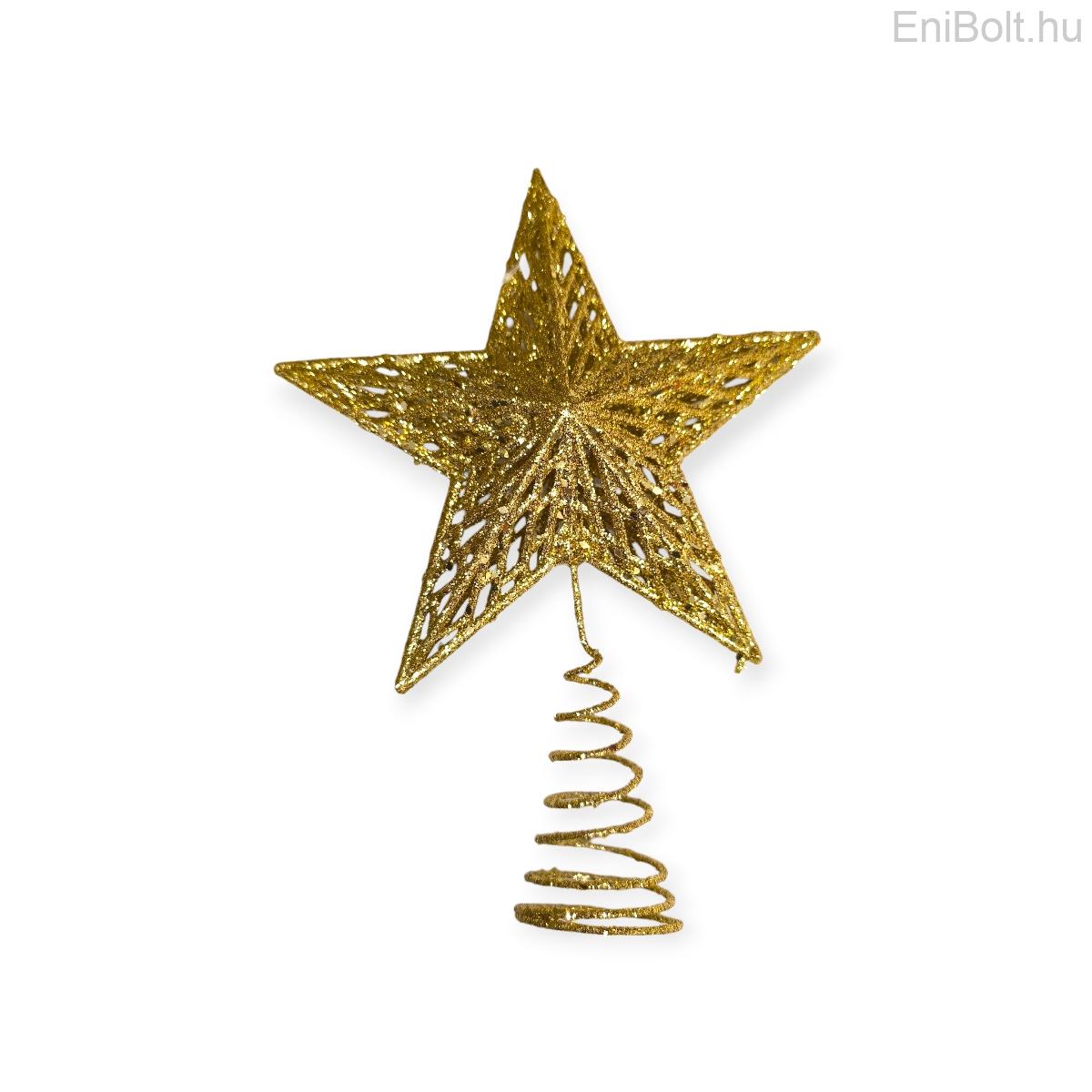 Elegáns arany színű, perforált mintás 3D csillag alakú karácsonyfa csúcsdísz. Fémes hatású, csillogó felületével különleges fényt és ünnepi hangulatot ad a karácsonyfának. Tökéletes választás klasszikus és modern dekorációkhoz is.