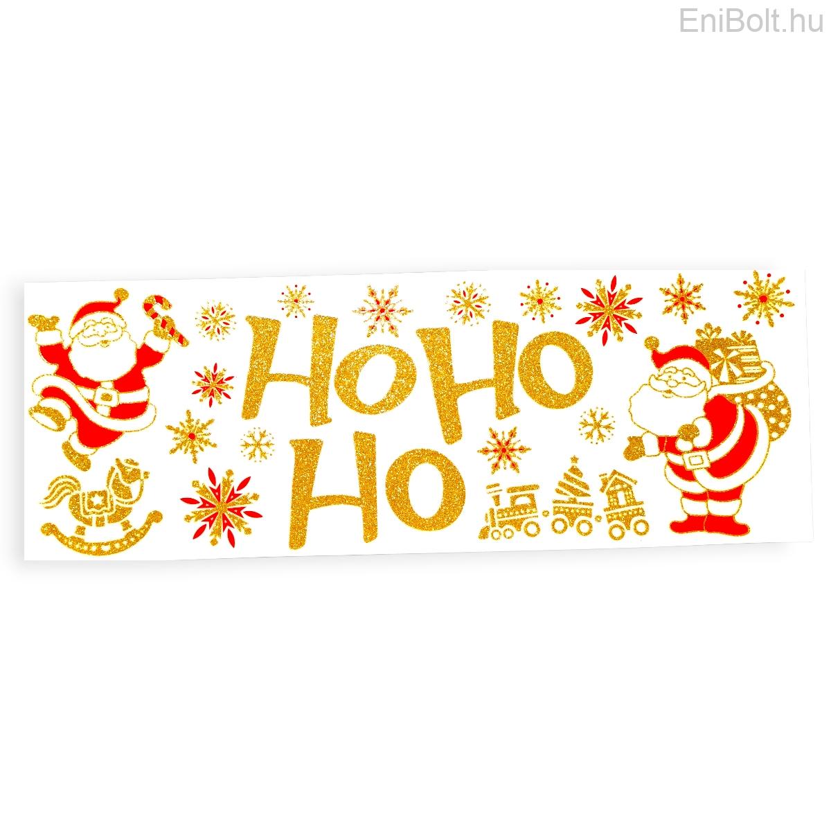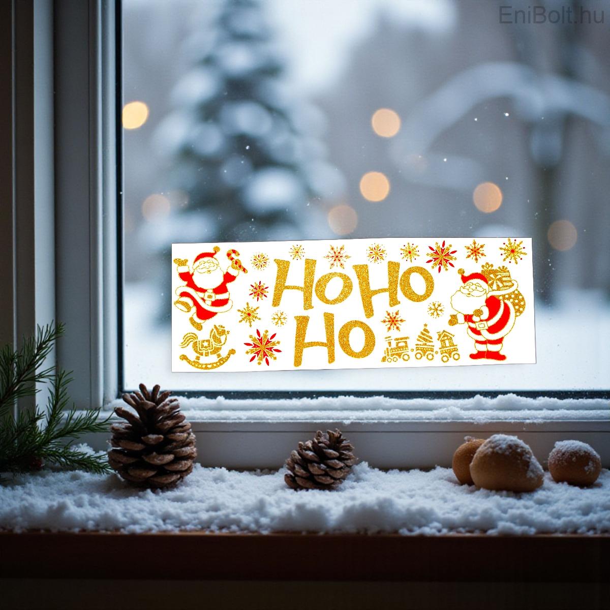 Dobd fel az ünnepi hangulatot ezzel a dekoratív Mikulásos ablakmatricával, amelyet a „Ho Ho Ho” felirat, játékos motívumok és arany csillogó részletek díszítenek.