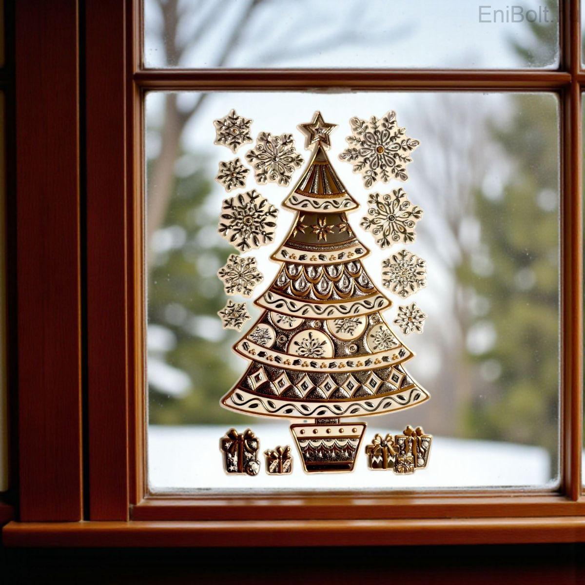 Varázsold ünnepivé otthonodat ezzel az arany–ezüst csillogó karácsonyi matricával, amely fenyőfát, hópelyheket és ajándékdobozokat ábrázol. Tökéletes ablakra, tükörre vagy bármilyen sima felületre, ahol mesebeli hangulatot szeretnél teremteni.