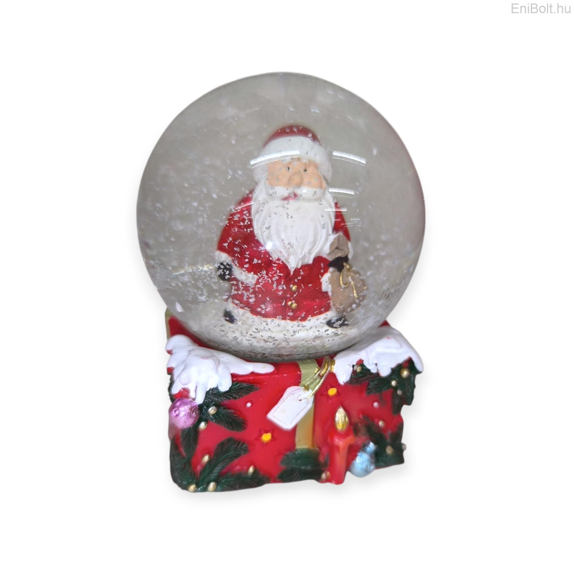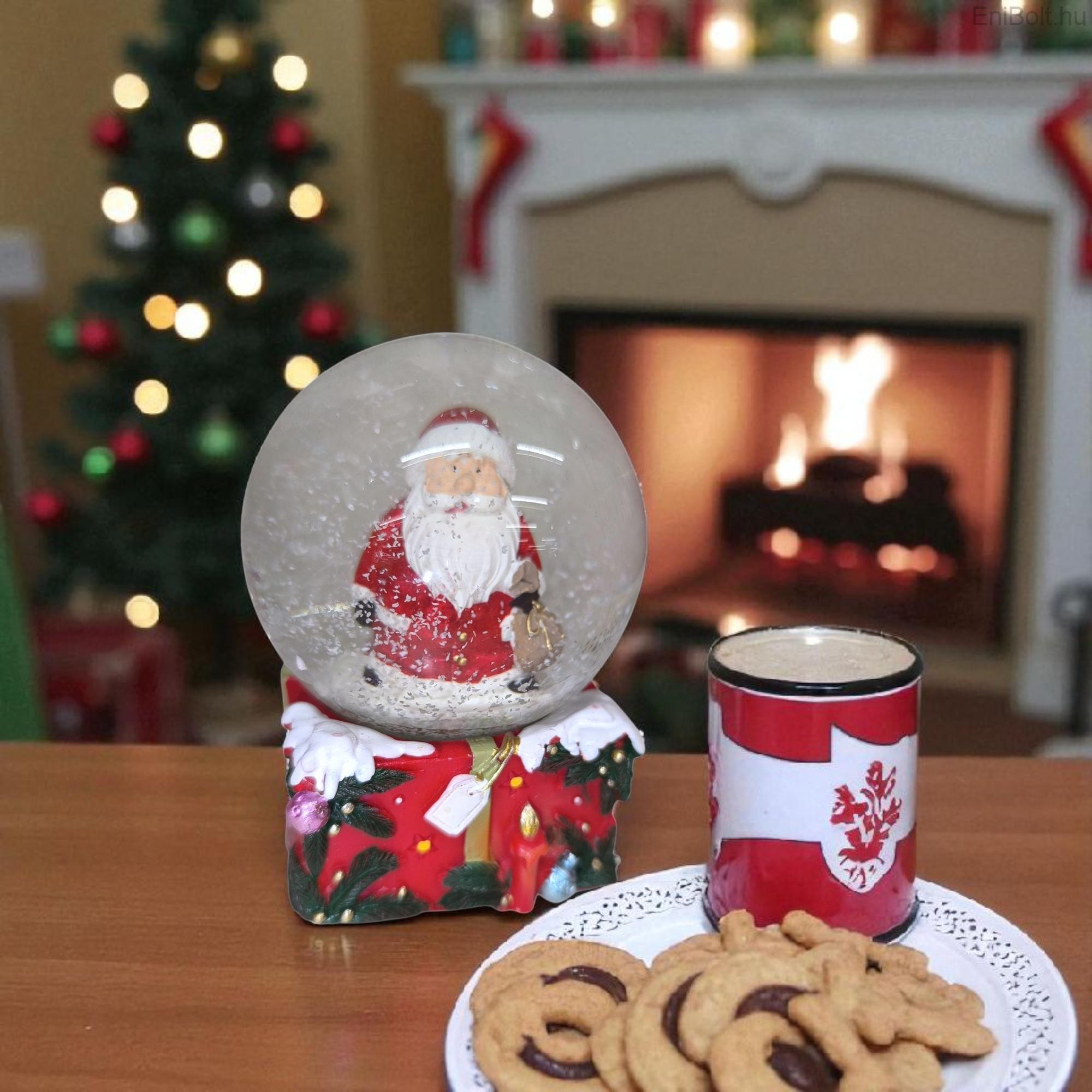 Dekoratív karácsonyi hógömb, amelyben a Mikulás arany szalaggal díszített ajándékdobozt tart, piros négyzet alakú alapon. Részletgazdag kidolgozásának és ünnepi színeinek köszönhetően tökéletes kiegészítője a karácsonyi dekorációnak. Kiváló választás ajándéknak vagy dísznek az ünnepi szezonra.