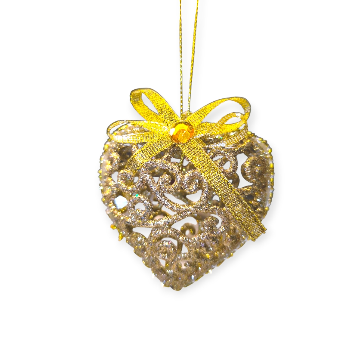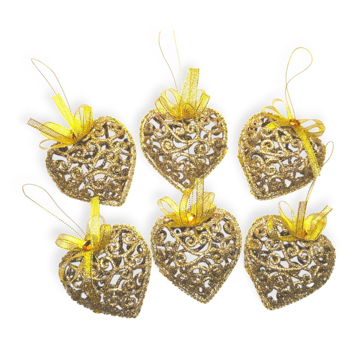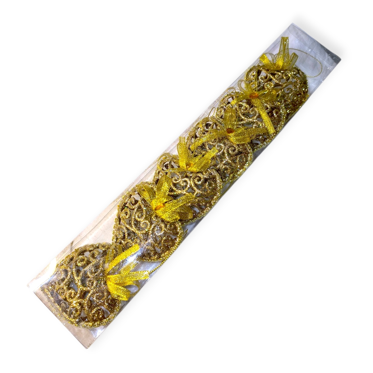 Kezdőlap » Karácsonyi dekorációk » Karácsonyfa gömbök » Arany díszek » Arany szív karácsonyfa dísz masnival 6 db-os készlet 7 cm
