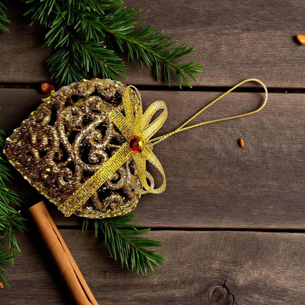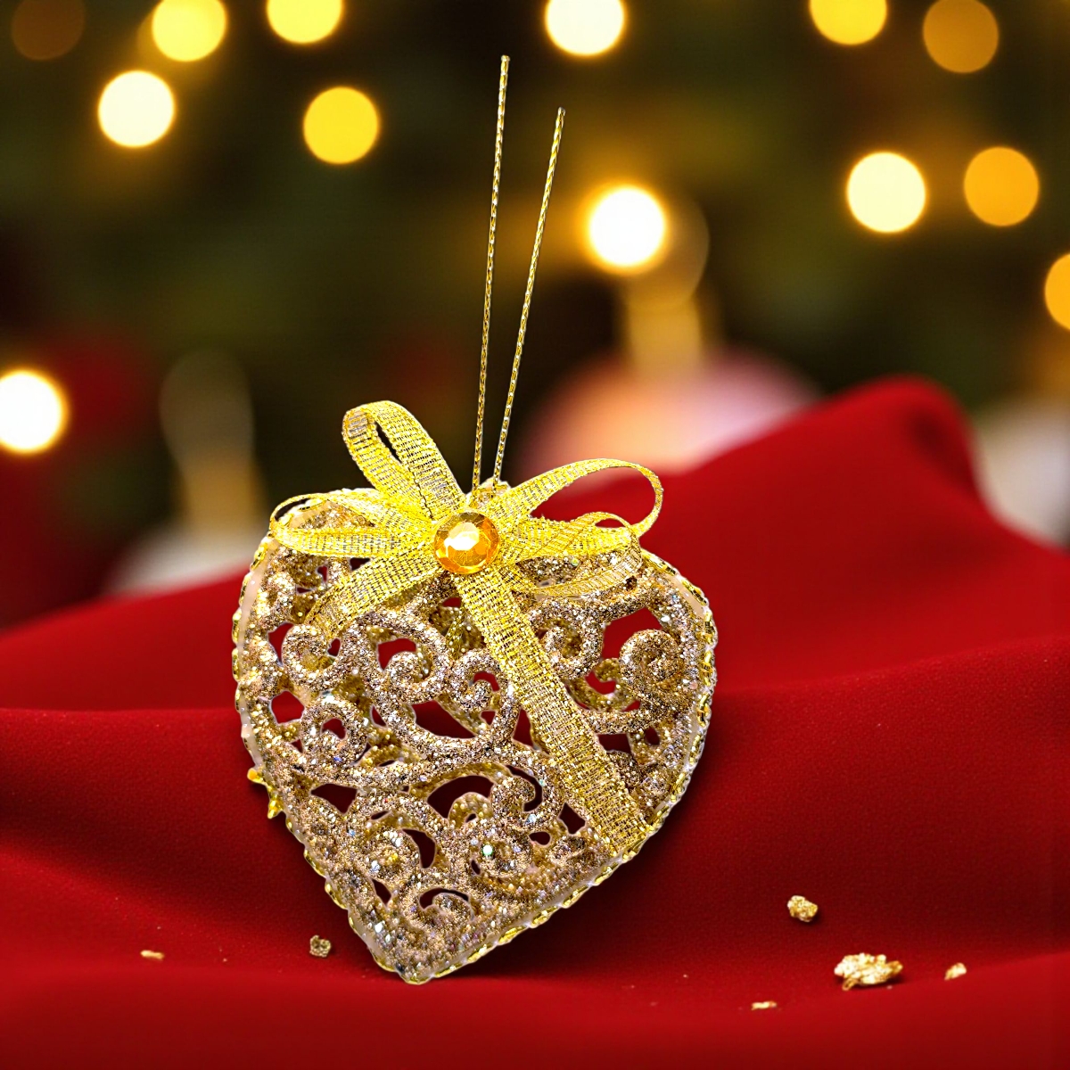 Romantikus és elegáns arany szív alakú karácsonyi díszek masnival, melyek különleges hangulatot kölcsönöznek a fának. A készlet 6 darab, 7 cm-es műanyag szívet tartalmaz, amelyek tökéletes kiegészítői az ünnepi dekorációnak.