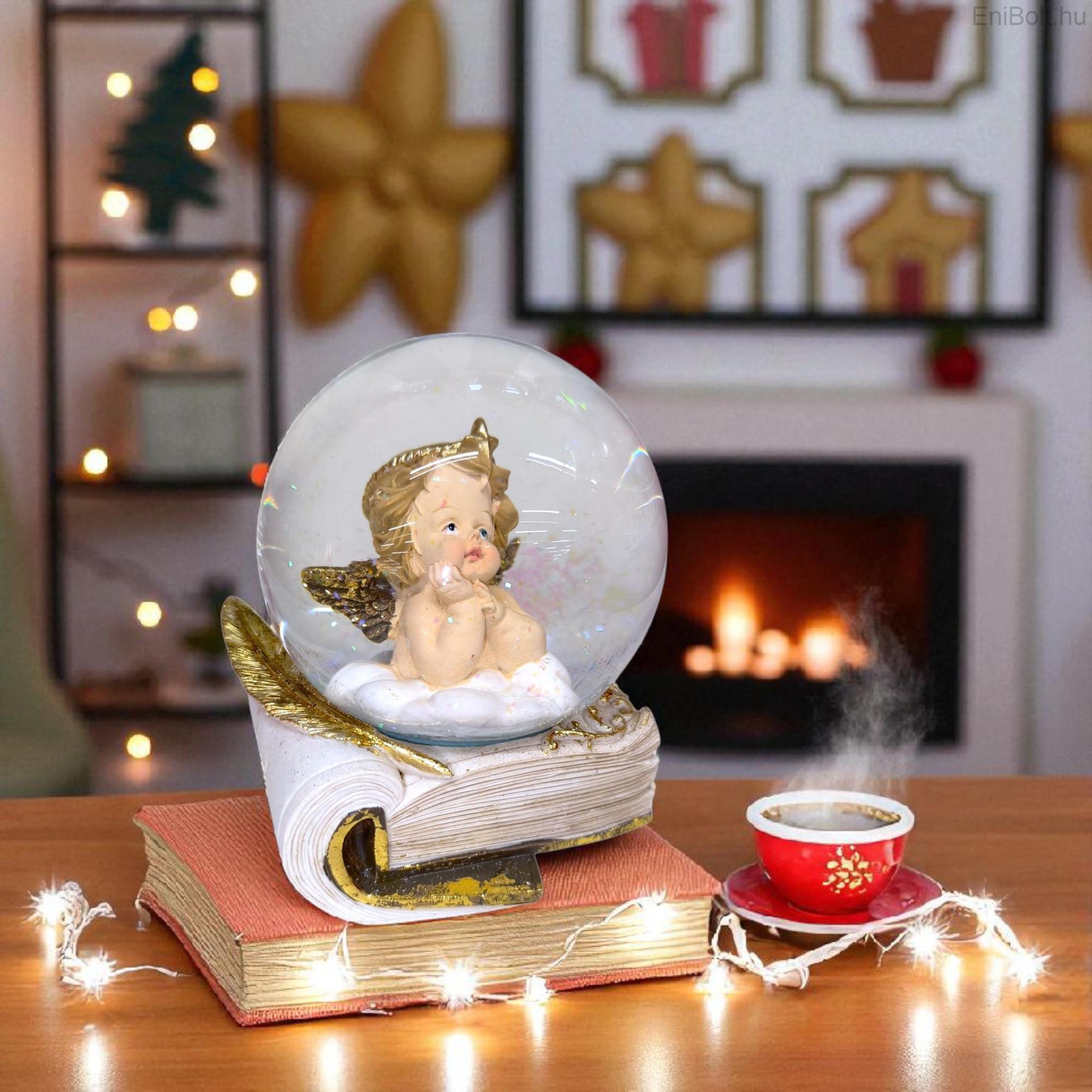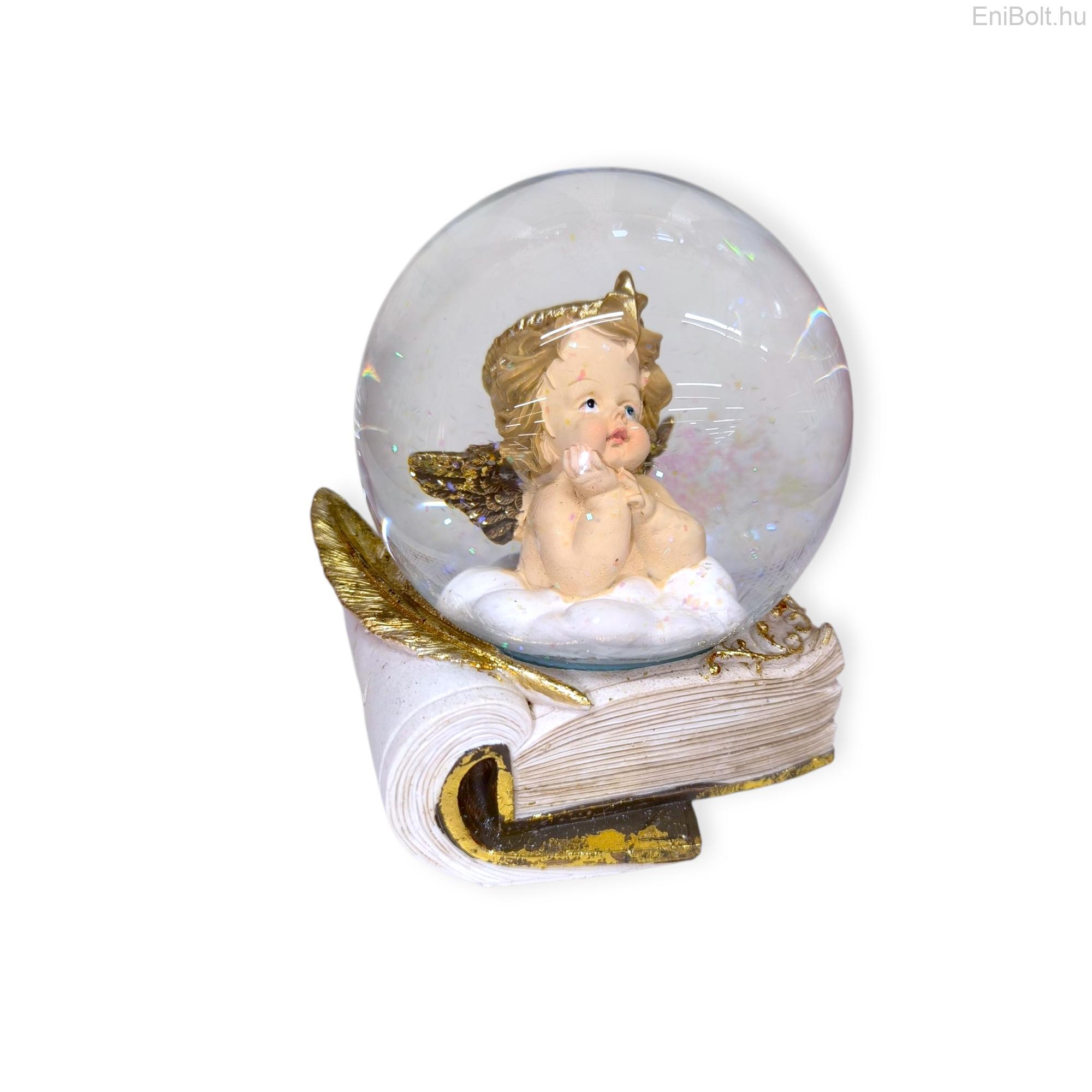 Kezdőlap » Karácsonyi dekorációk » Hógömbök » Aranyszárnyú angyal hógömb könyv talapzaton 12,5 cm
