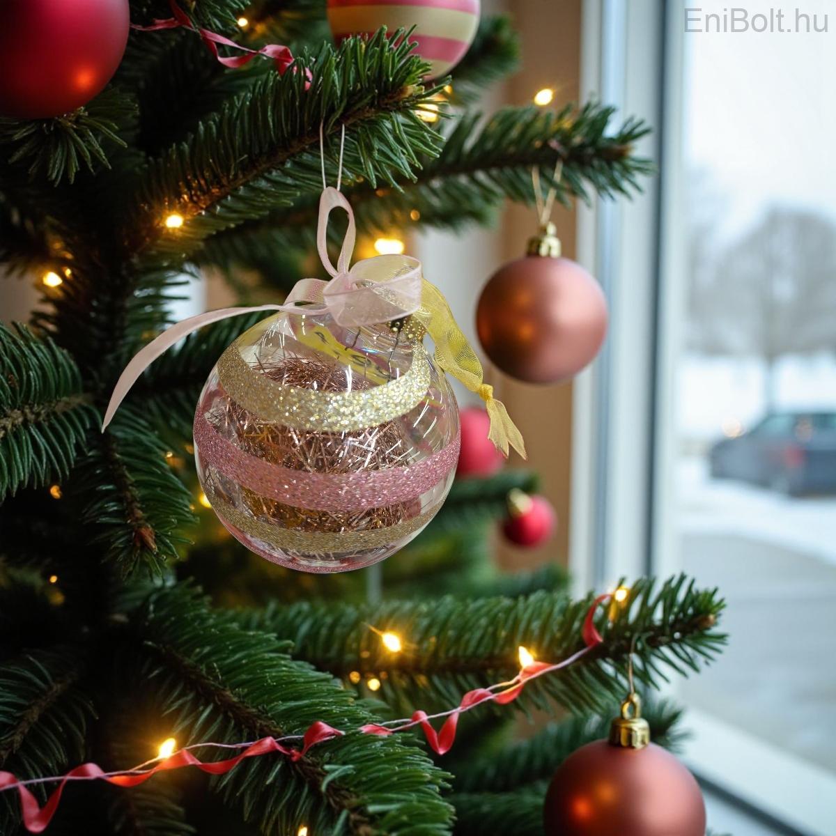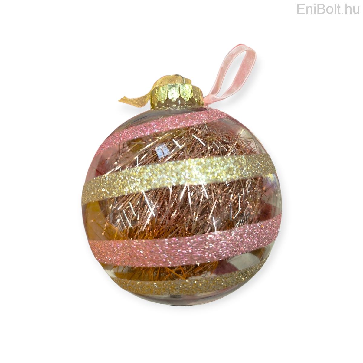 Átlátszó karácsonyfadísz csillámos csíkokkal és rózsaszín csillogó díszszállal 10cm