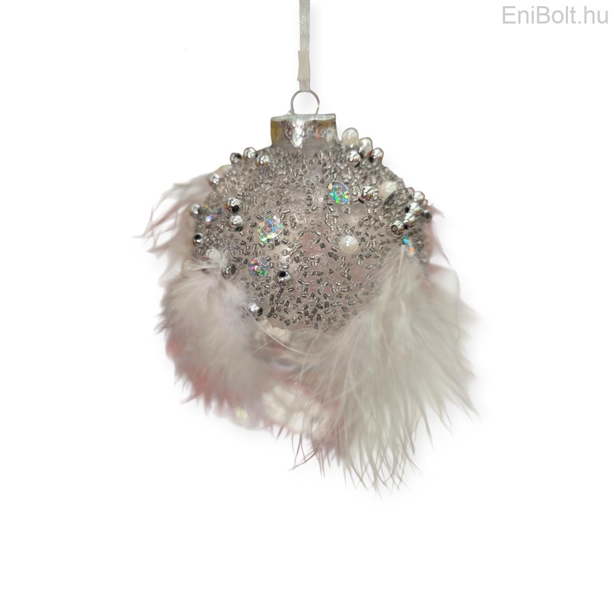 Kezdőlap » Karácsonyi dekorációk » Karácsonyfa gömbök » Fehér díszek » Átlátszó karácsonyfadísz ezüst strasszokkal és fehér tollakkal 8cm