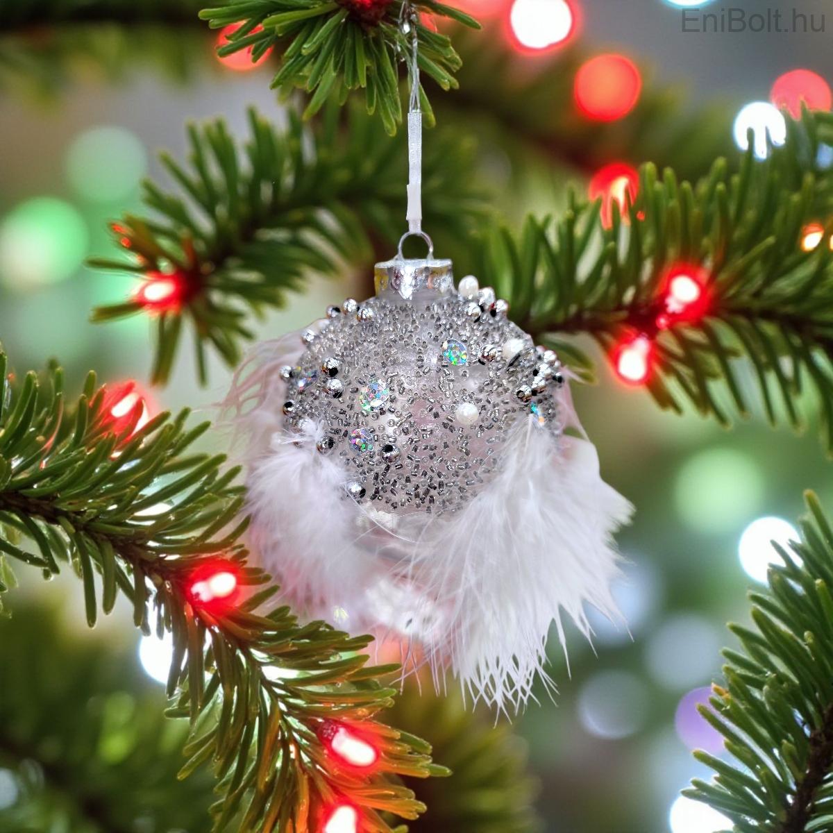 Elegáns és légies átlátszó karácsonyfadísz, amelyet ezüst strasszok, finom gyöngyök és puha fehér tollak díszítenek. A csillogó részletek és az áttetsző forma kifinomult fényt adnak a karácsonyfának.
