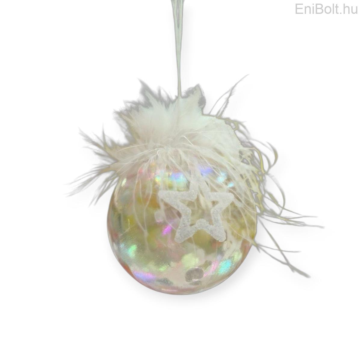 Kezdőlap » Karácsonyi dekorációk » Karácsonyfa gömbök » Fehér díszek » Átlátszó karácsonyfadísz fehér tollakkal és csillagmintával 8cm
