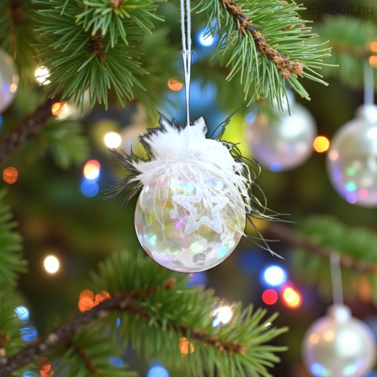 Elegáns átlátszó karácsonyfadísz, belsejében puha fehér tollakkal és csillogó fehér csillagmintával. A holografikus részletek finoman tükrözik a fényeket, így különleges, meghitt fényt varázsolnak a karácsonyfára.