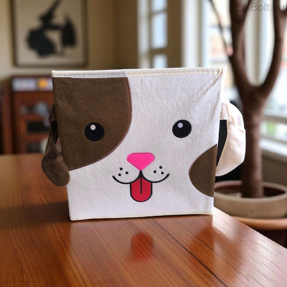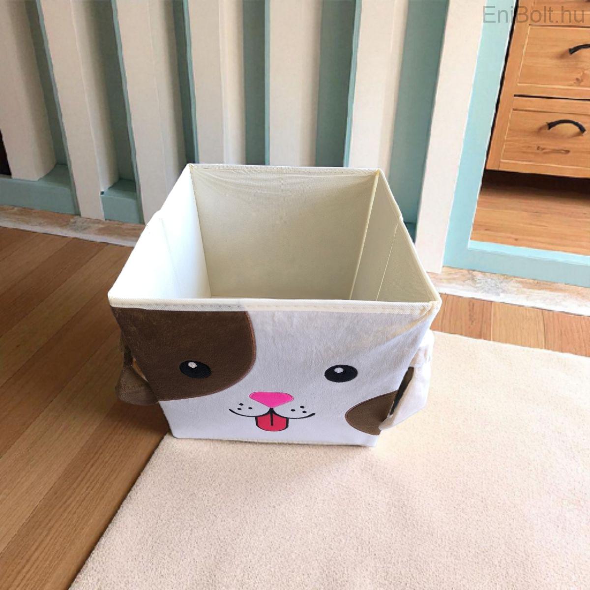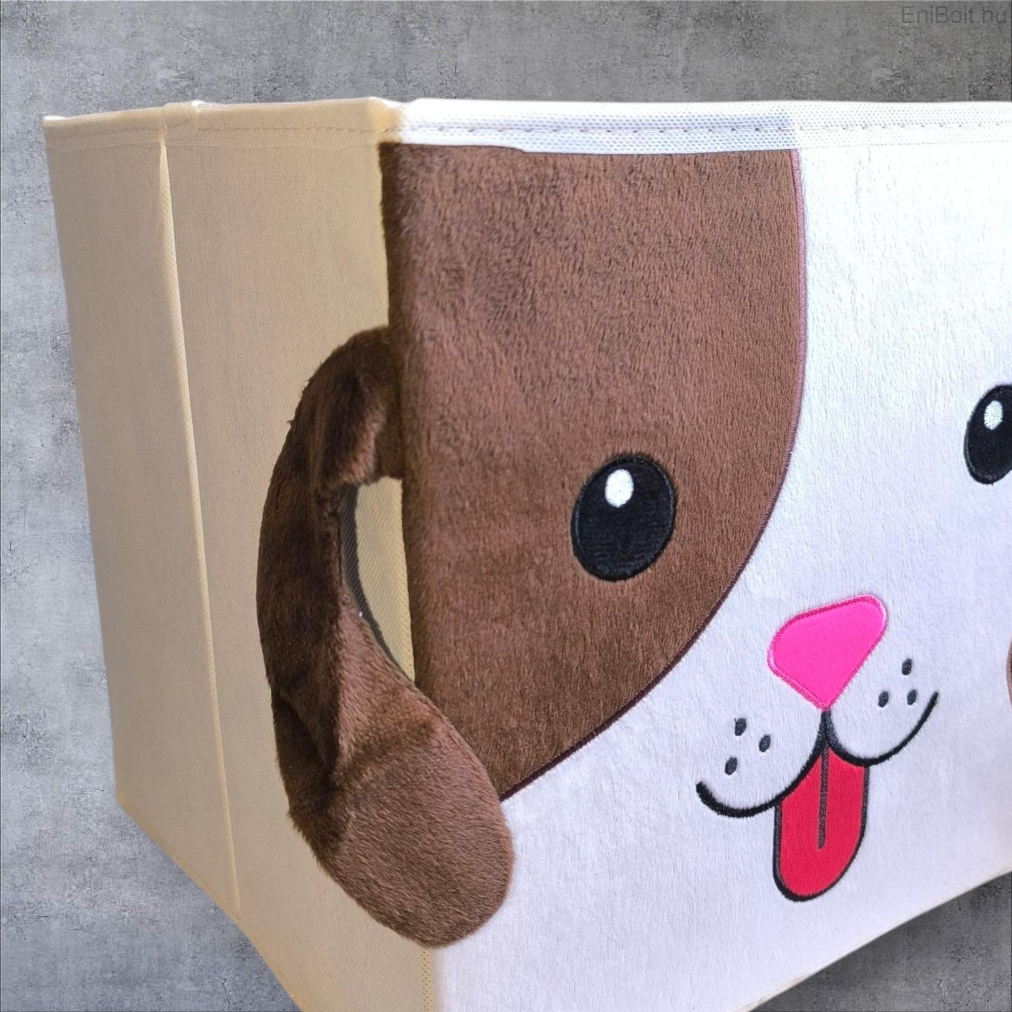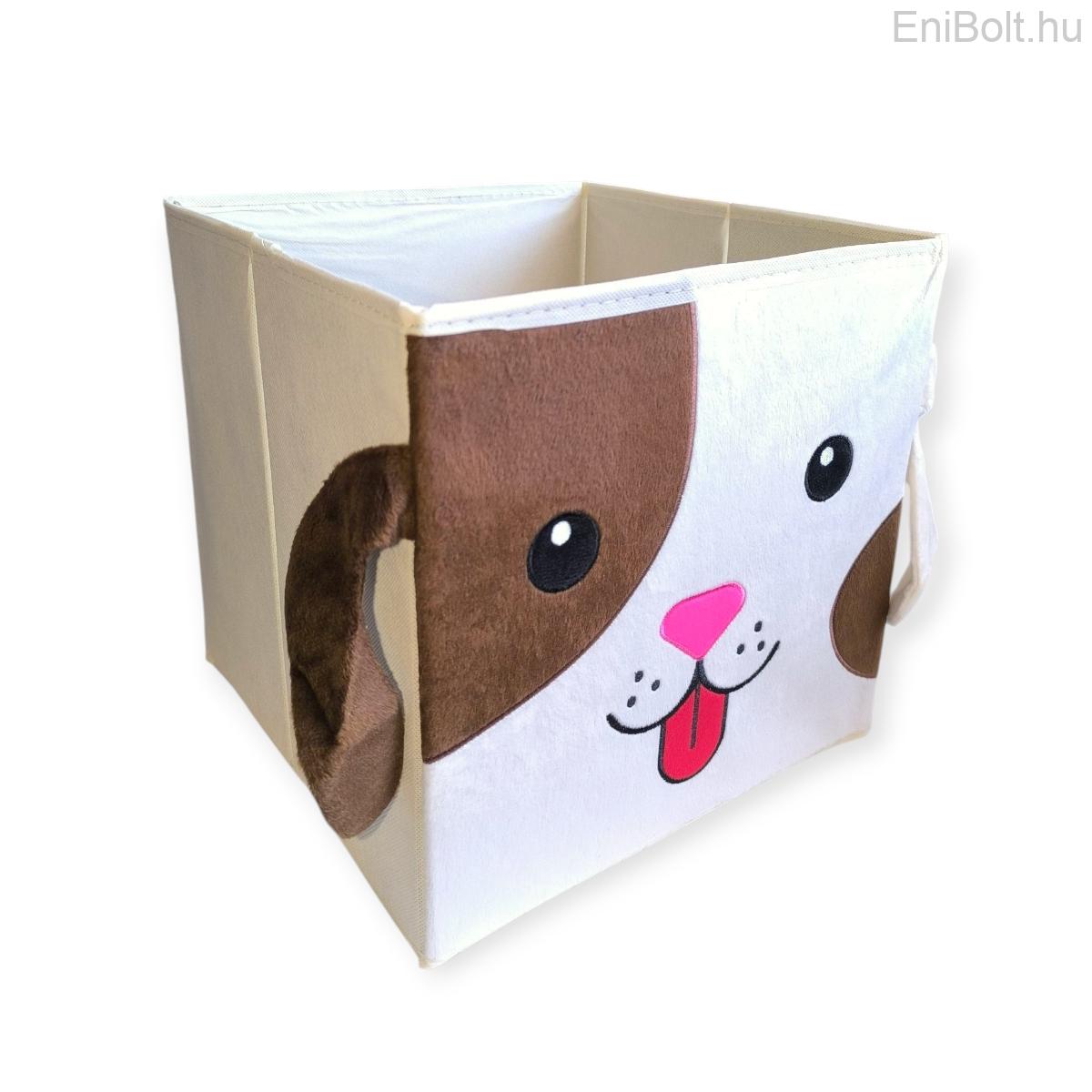 Praktikus bársonybarna bézs tárolódoboz fedél nélkül, kutyamintával díszítve, amely ideális játékok, apróságok rendszerezésére a gyerekszobában. Tartós polipropilén anyagból készült, könnyen tisztán tartható és egyszerűen kezelhető. Mérete (30x30x30 cm) elegendő helyet biztosít különféle holmik tárolására, uniszex kialakításának köszönhetően fiúknak és lányoknak egyaránt ajánlott.