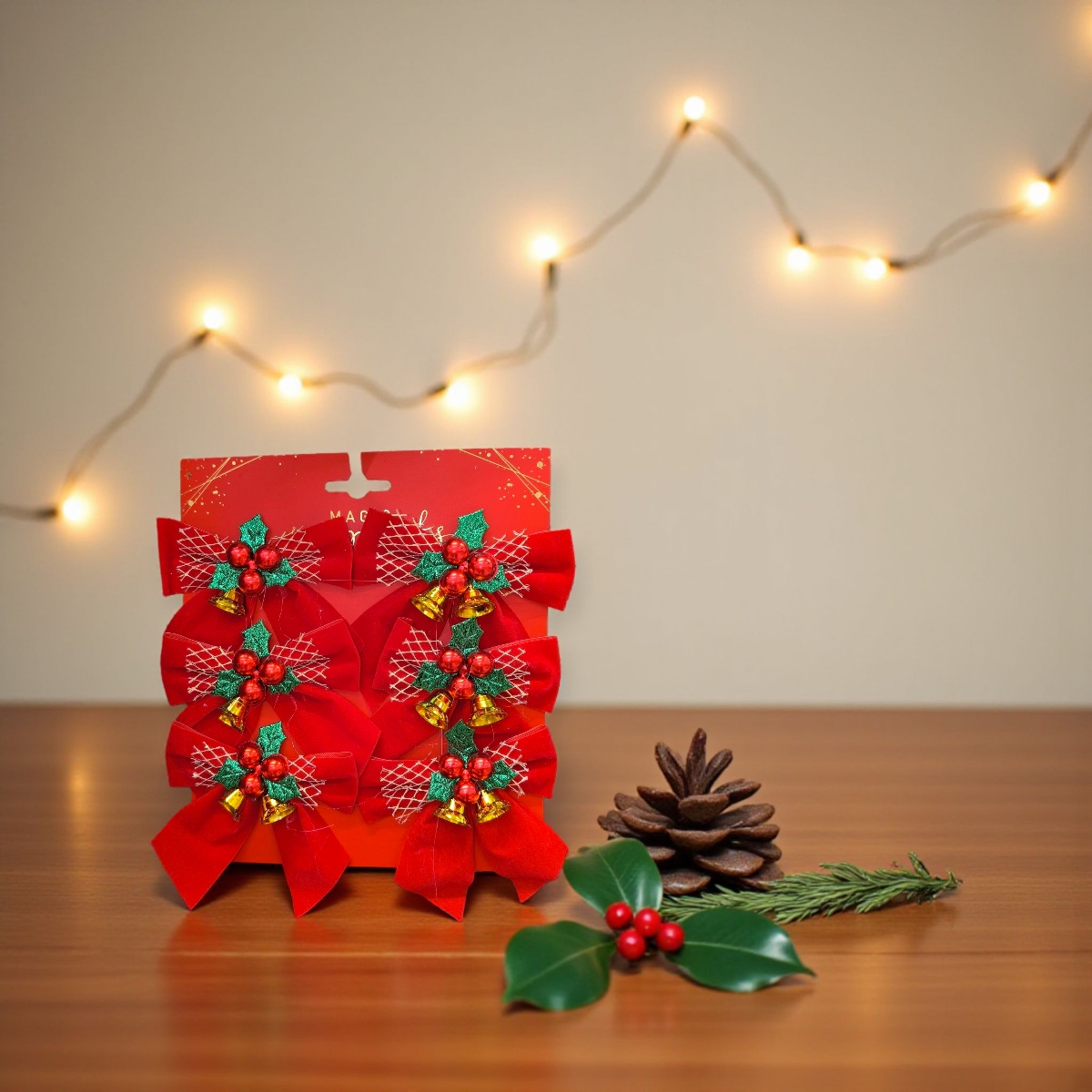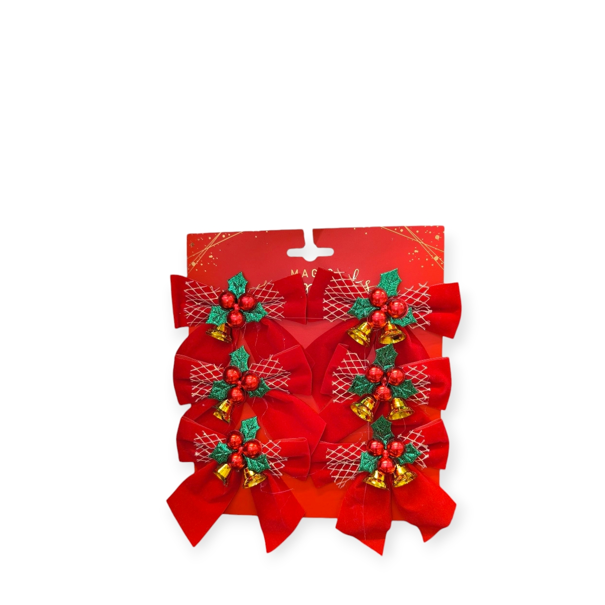 Kezdőlap » Karácsonyi dekorációk » Karácsonyfa gömbök » Piros díszek » Bársonyos piros karácsonyi dekoratív masni haranggal és fagyönggyel 10cm – 6 db