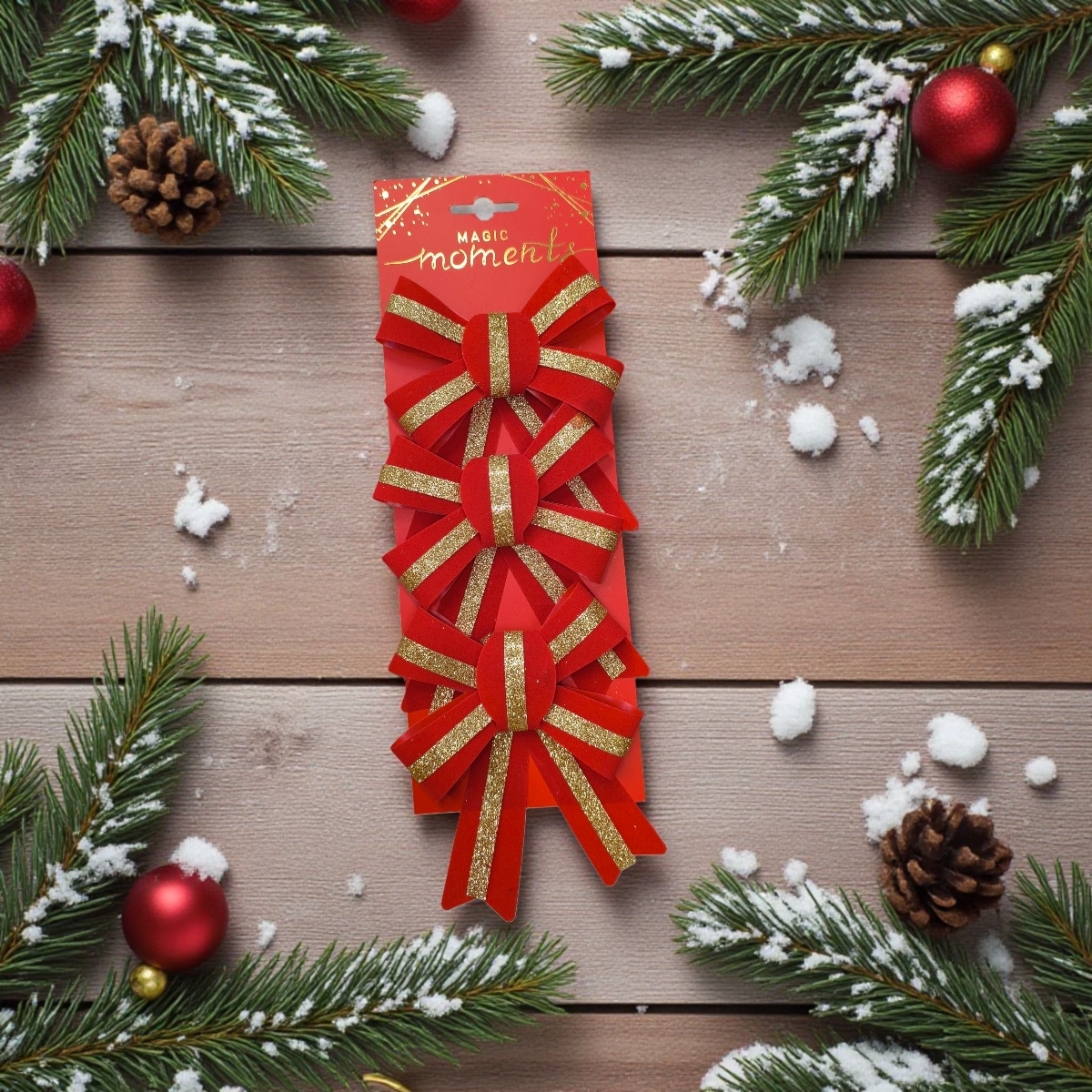 Elegáns, bársonyos piros karácsonyi dekoratív masnik arany szegéllyel, melyek stílusos megjelenést kölcsönöznek bármely ünnepi dekorációnak. Tökéletes választás karácsonyfára, koszorúkra, ajándékokra, függönyökre vagy ajtódíszekre.