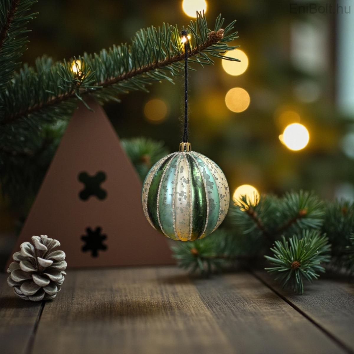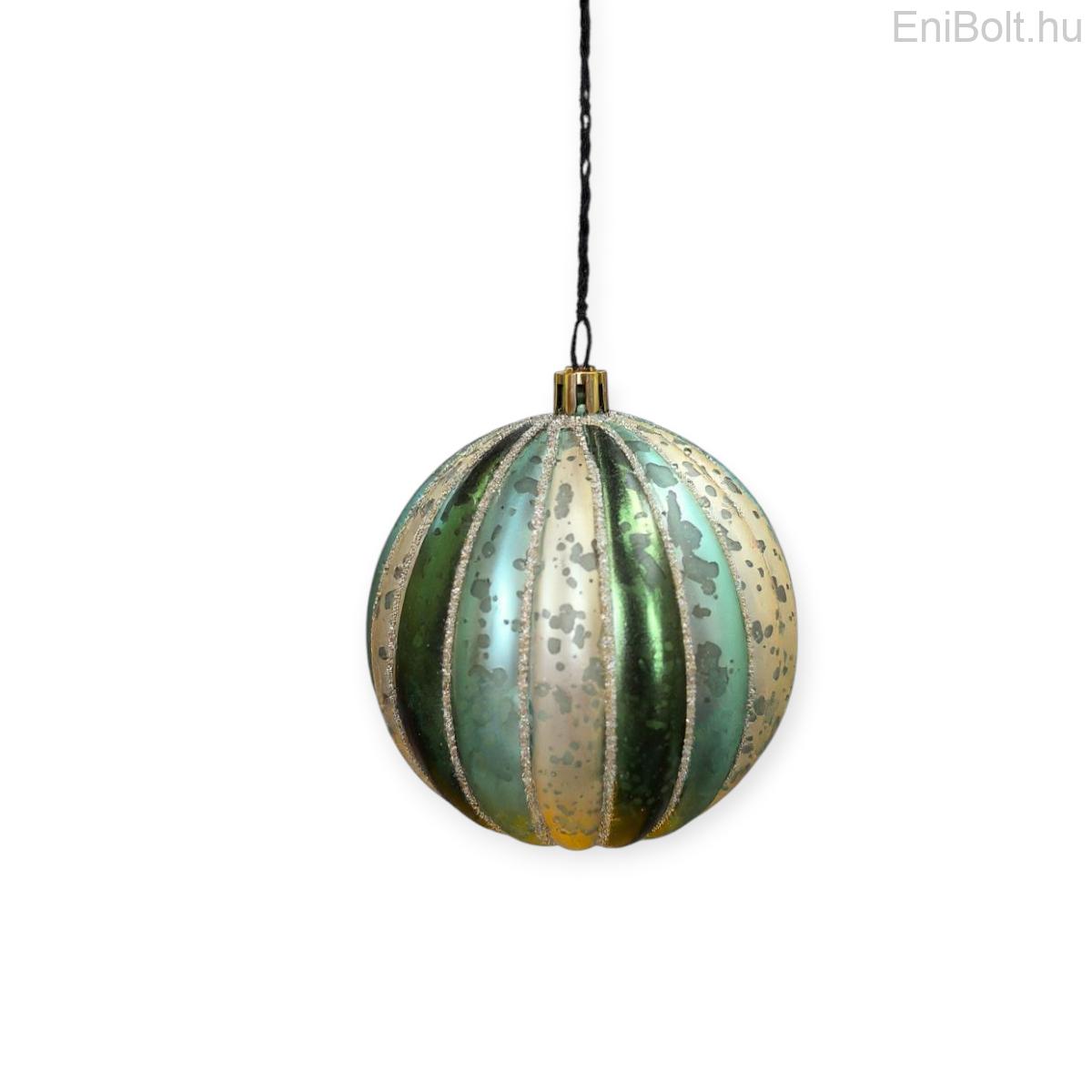 Bársonyos zöld arany csíkos karácsonyi gömb dísz 10cm