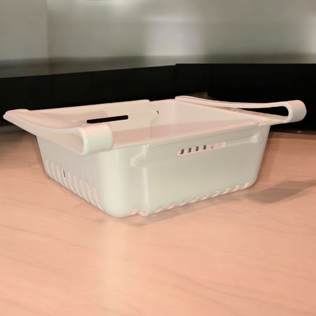 Rendszerezze könnyedén hűtőszekrényét ezzel a praktikus, kihúzható tárolókosárral! A fehér műanyag hűtő rendszerező kosár a hűtőszekrény polca alá rögzíthető, így helyet takarít meg, és segít a tiszta, átlátható tárolásban. Kihúzható kialakítása lehetővé teszi az élelmiszerek gyors és kényelmes elérését. Ideális gyümölcsök, zöldségek, kisebb élelmiszerek, snackek tárolására.