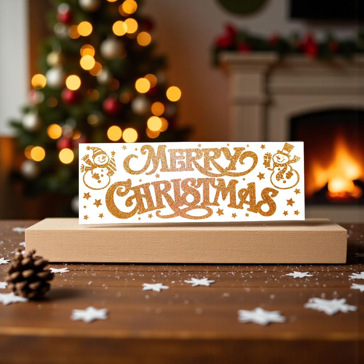 Bronz csillogó karácsonyi matrica – Merry Christmas hóemberes dekoráció