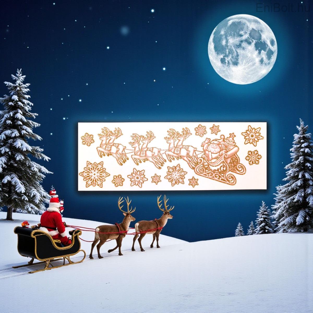 Dobd ünnepi díszbe otthonodat ezzel a bronz csillogású karácsonyi matricával, amely Mikulást szánnal, rénszarvasokkal és hópelyhekkel ábrázolja. Az elegáns bronz szín különleges és meleg hangulatot teremt, amely tökéletesen mutat ablakokon, tükrökön vagy más üvegfelületeken.