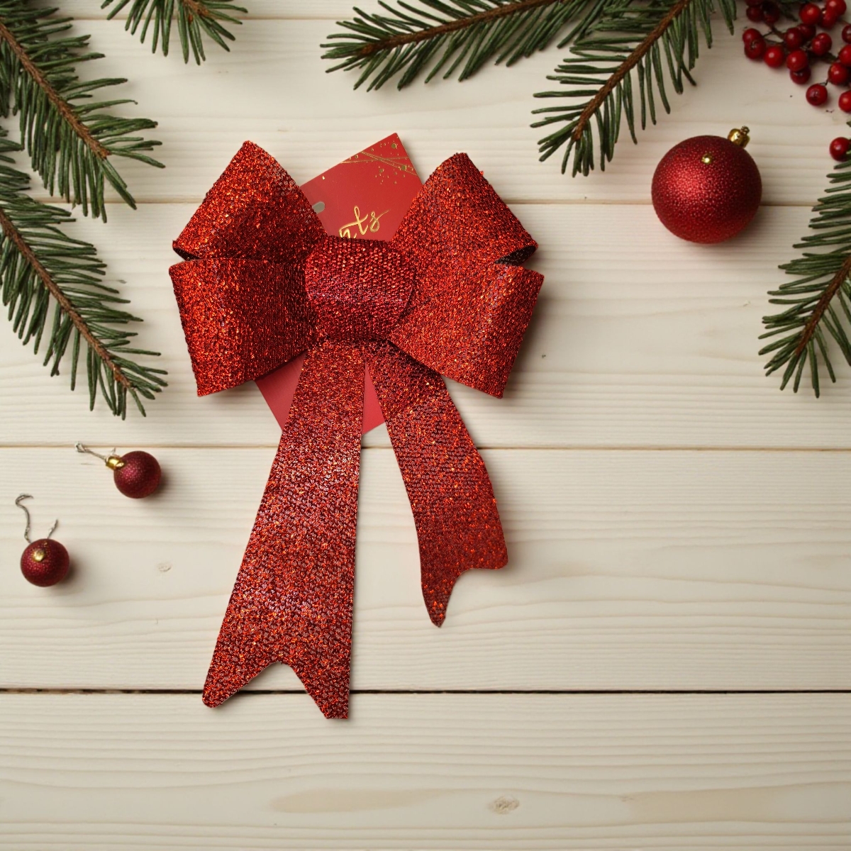 Varázsold meghitté és fényessé az ünnepi dekorációt ezzel a nagy méretű, csillogó piros karácsonyi masnival! Elegáns megjelenése minden otthont ünnepivé tesz.