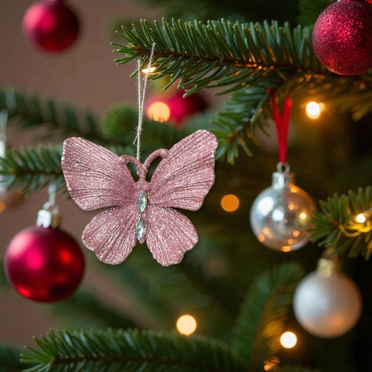 Ez a bájos karácsonyfadísz rózsaszín pillangó formájú, csillámmal és kristályokkal díszített, amely ünnepi varázst kölcsönöz a karácsonyfának.