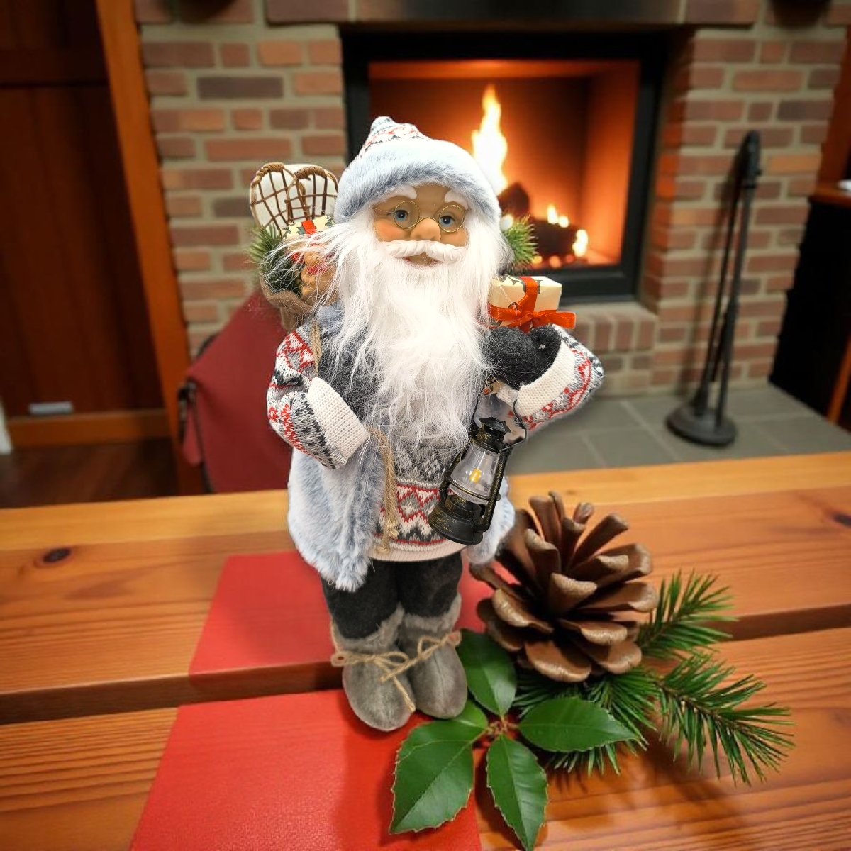 Hangulatos, karácsonyi Mikulás figura szürke mellényben és apró ajándékokkal a kezében. Kiváló választás az ünnepi időszakra, polcra, asztalra vagy ablakpárkányra helyezve egyaránt feldobja az otthonodat.
