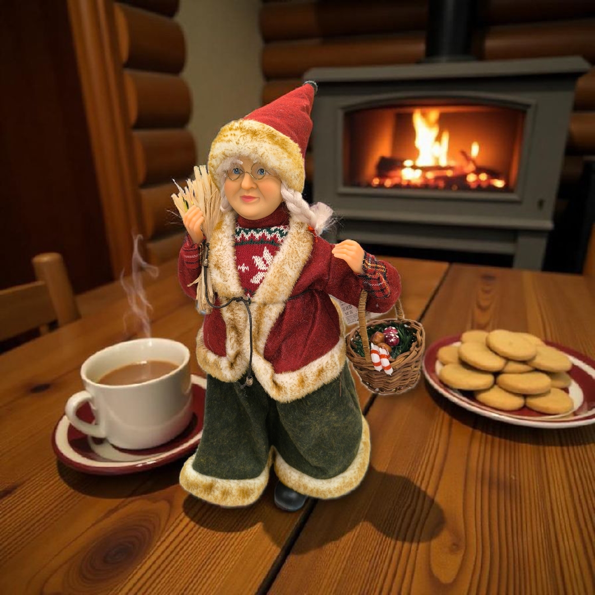 Dekoratív Télanyó (Mrs. Claus) figura kosárral, amely melegséget és ünnepi hangulatot visz otthonába. A részletgazdagon kidolgozott ruha és kiegészítők elegáns, vintage stílust idéznek, így tökéletes választás karácsonyi díszítéshez.