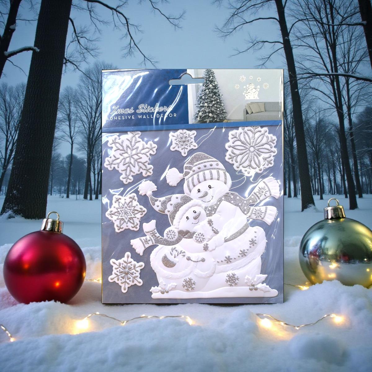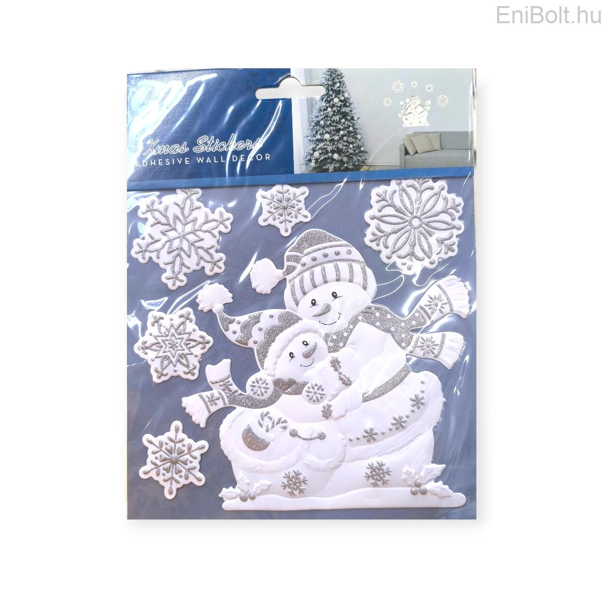 Kezdőlap » Karácsonyi dekorációk » Karácsonyi matricák » Dekoratív karácsonyi matrica hóember és fehér hópelyhek ezüst csillámmal 18x23cm