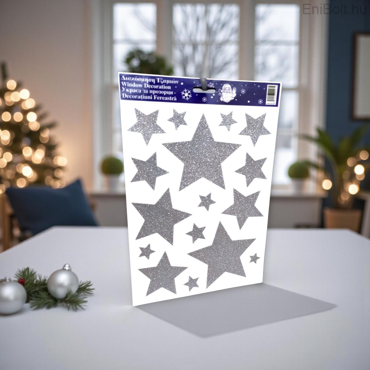 Dekoratív karácsonyi matricák csillogó ezüst csillagokkal – 20x30 cm