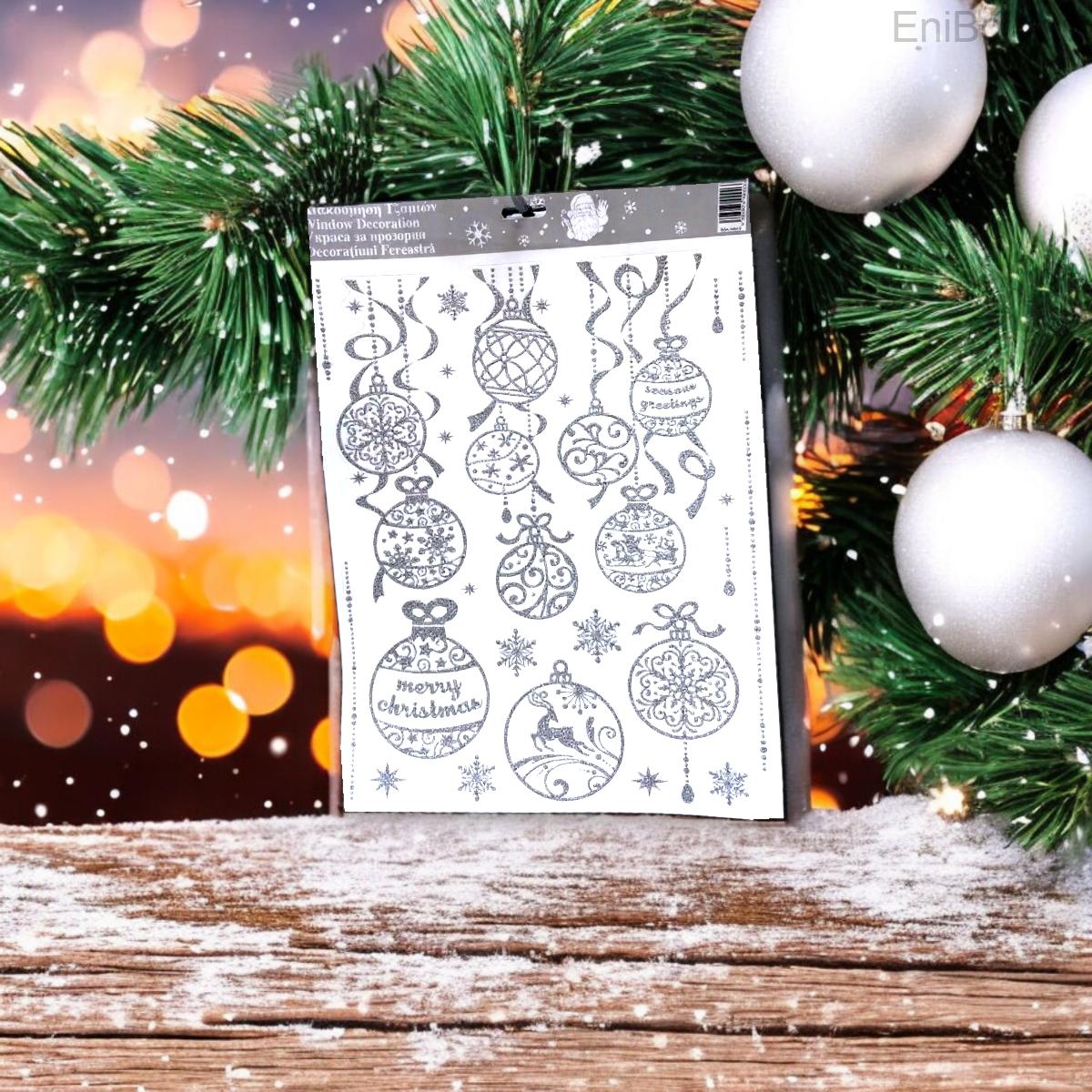 Dekoratív karácsonyi matricák függő földgömbökkel és elegáns ezüst csillámmal díszített szalagokkal. Kiváló választás ablakokra, tükrökre vagy üvegfelületekre, hogy ragyogó, ünnepi hangulatot varázsolj otthonodba.