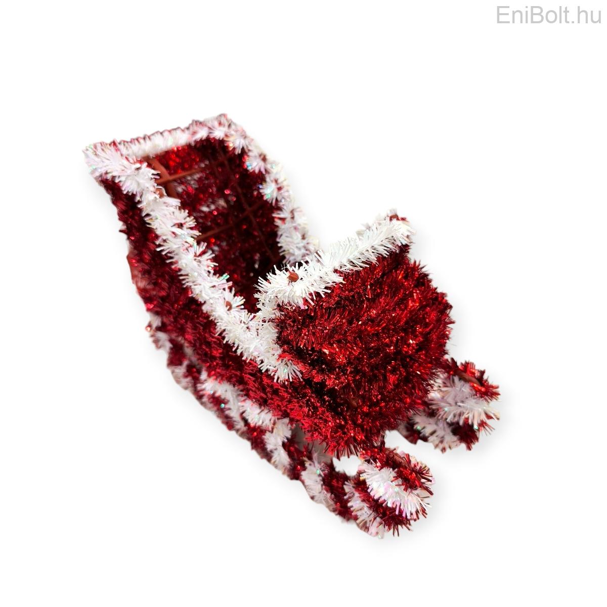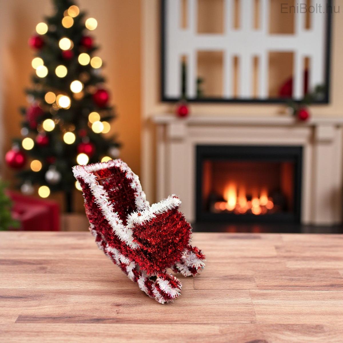 Hangulatos karácsonyi dekoráció piros és fehér talmival díszített műanyag szánkó formában. Tökéletes választás az ünnepi asztal, polc vagy ablakpárkány feldíszítésére. Klasszikus, mégis látványos darab, amely a karácsony meghitt hangulatát idézi.