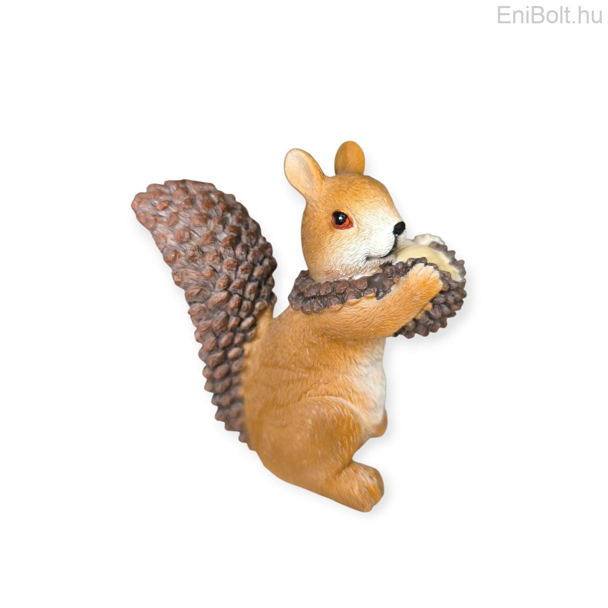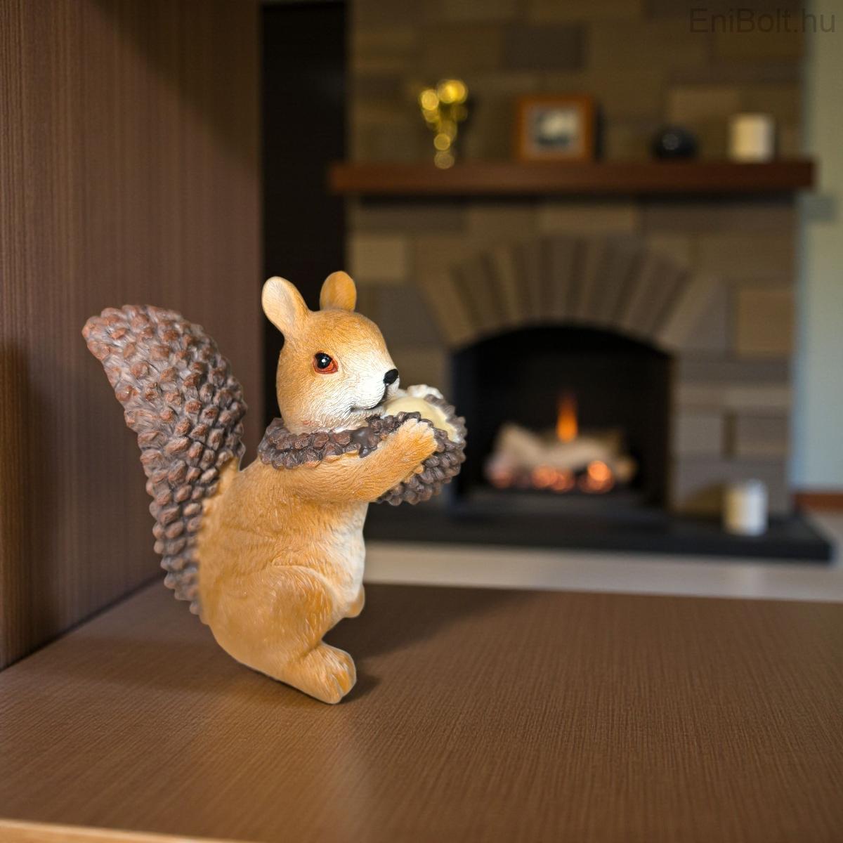 Aranyos mókus figura, amely egy makkot tart a kezében – tökéletes kiegészítője a karácsonyi falunak vagy a téli dekorációnak. A polirezinből készült dísz részletgazdag kidolgozásával és természetes barna árnyalatával meghitt hangulatot teremt otthonodban.