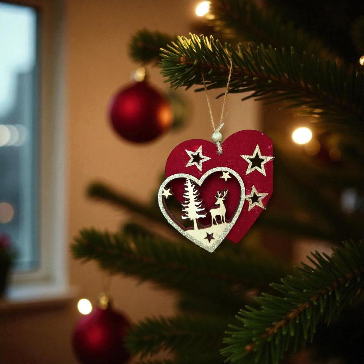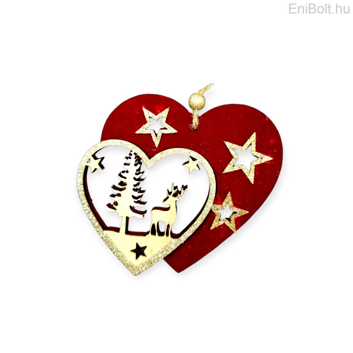 Dupla szív alakú karácsonyfadísz fa alapból, bársonyos bordó felülettel és arany csillámos szarvas mintával. Meleg, ünnepi hangulatot teremt a karácsonyfán vagy téli dekorációban.