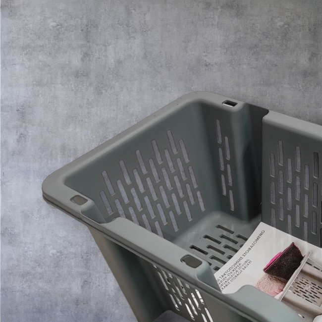 Egymásra rakható szürke műanyag tárolókosár nyitható és perforált oldalakkal, amely lehetővé teszi praktikus polcrendszer kialakítását.