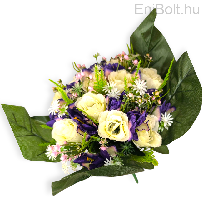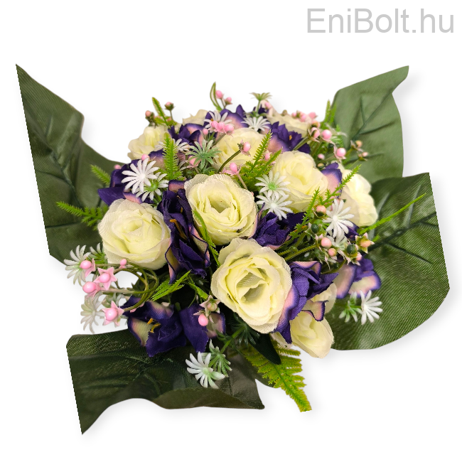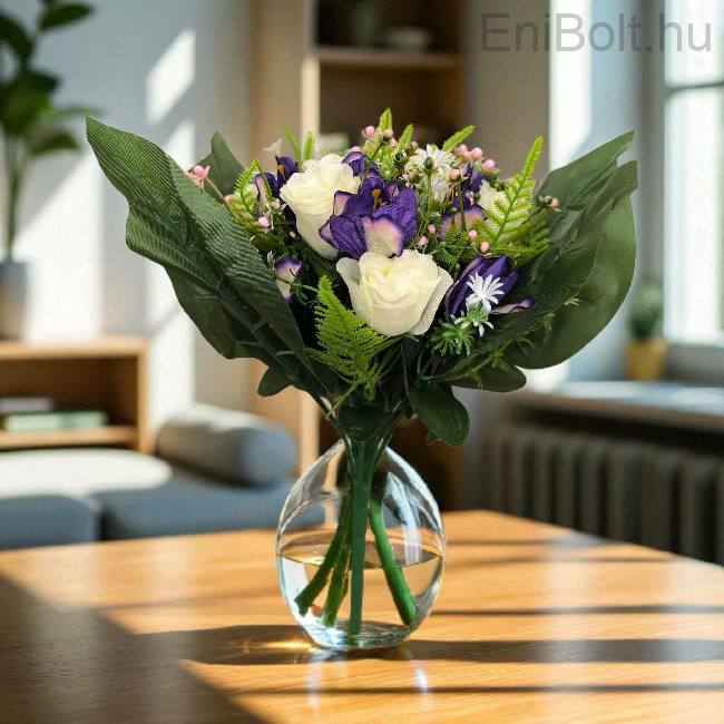 Ez az elegáns művirágcsokor gyönyörű fehér rózsákból és lila orchideákból áll, így ideális választás otthonod stílusos díszítéséhez. A 34 cm magas csokor természetes hatást kelt, és tökéletesen illik tavaszi, romantikus vagy modern enteriőrökbe. Tartós és gondozásmentes megoldás virágdíszítéshez.