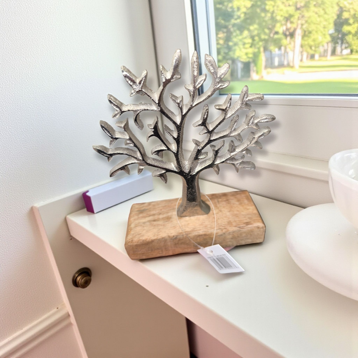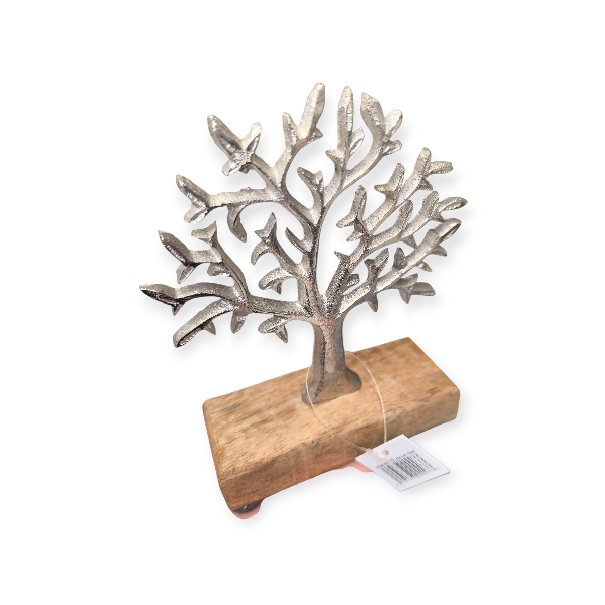 Stílusos Életfa asztaldísz metál ezüst színben, természetes fa talppal. Modern, mégis elegáns kiegészítő, amely harmóniát és nyugalmat sugároz otthonodban. Az ezüst fémes fény tökéletesen kiegészíti a fa melegségét, így remekül illik modern, klasszikus vagy rusztikus enteriőrbe is.