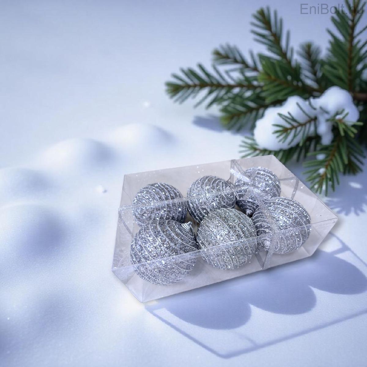 A habszivacs alapú gömböket finom ezüst csipke és csillogó glitter díszíti, amely mesés fényt kölcsönöz a fának és az ünnepi enteriőrnek.