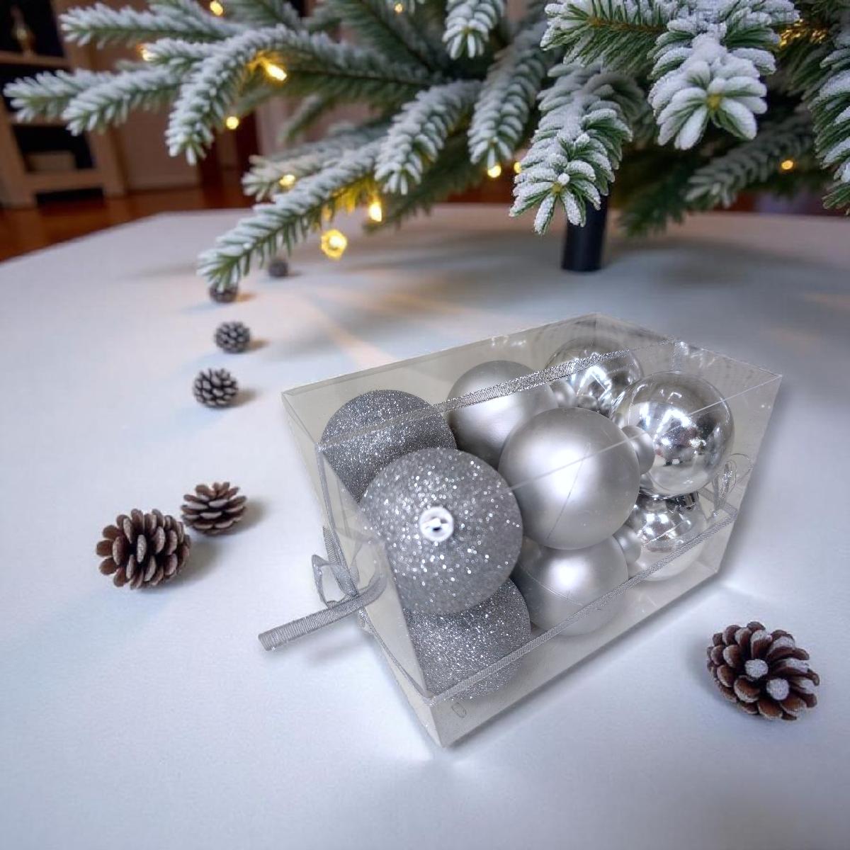 Tedd különlegessé a karácsonyfád ezzel a 12 darabos ezüst karácsonyfadísz szettel, amely matt, fényes és csillámos gömböket tartalmaz.
