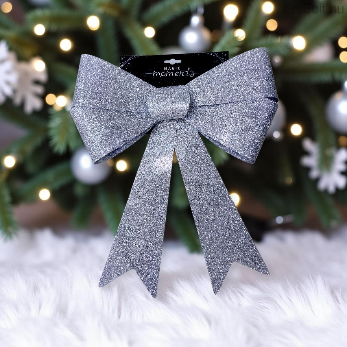 Elegáns ezüst karácsonyi masni csillámos felülettel, amely tökéletes kiegészítője az ünnepi dekorációnak. Használd karácsonyfadíszként, ajtódíszhez, ajándékcsomagoláshoz vagy függönyre tűzve – mindenhol ragyogó ünnepi hangulatot teremt.