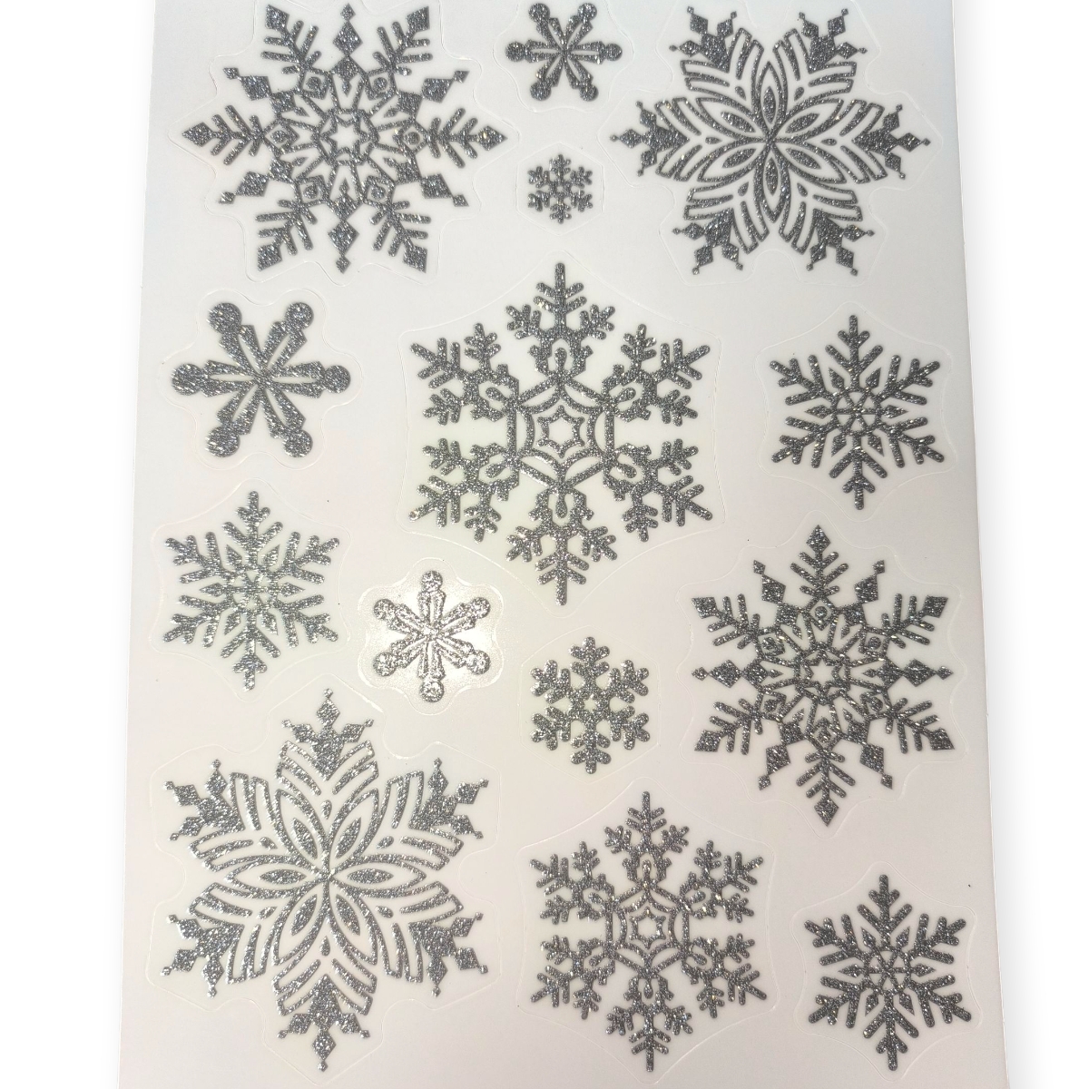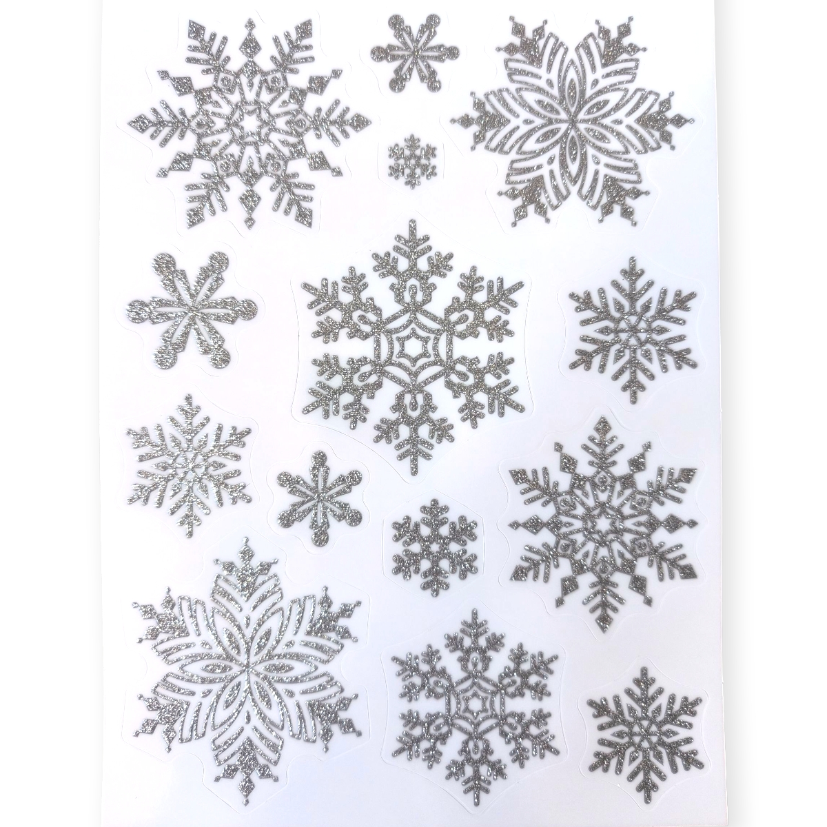 Dekoratív karácsonyi matricák, ezüstpelyhek csillogással.