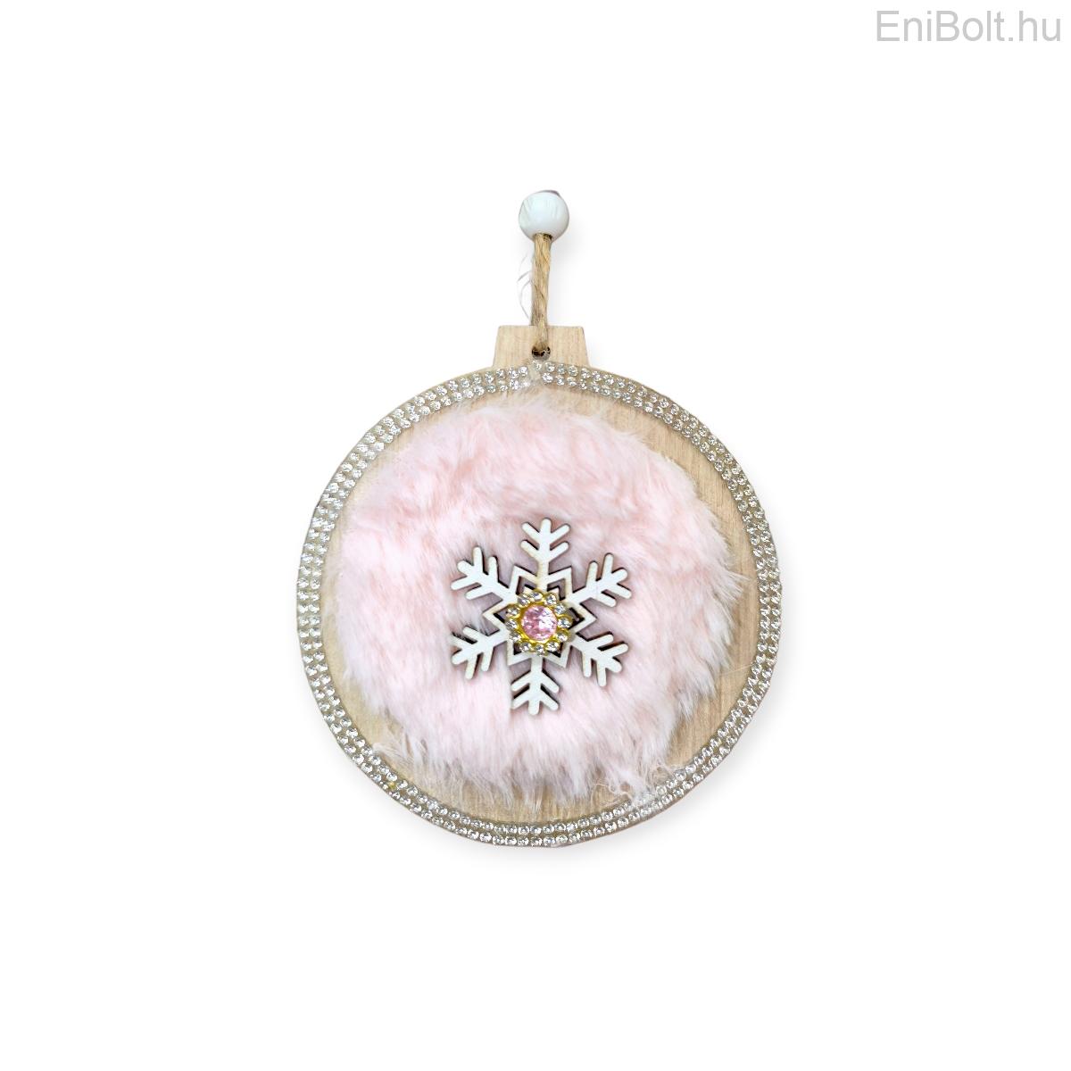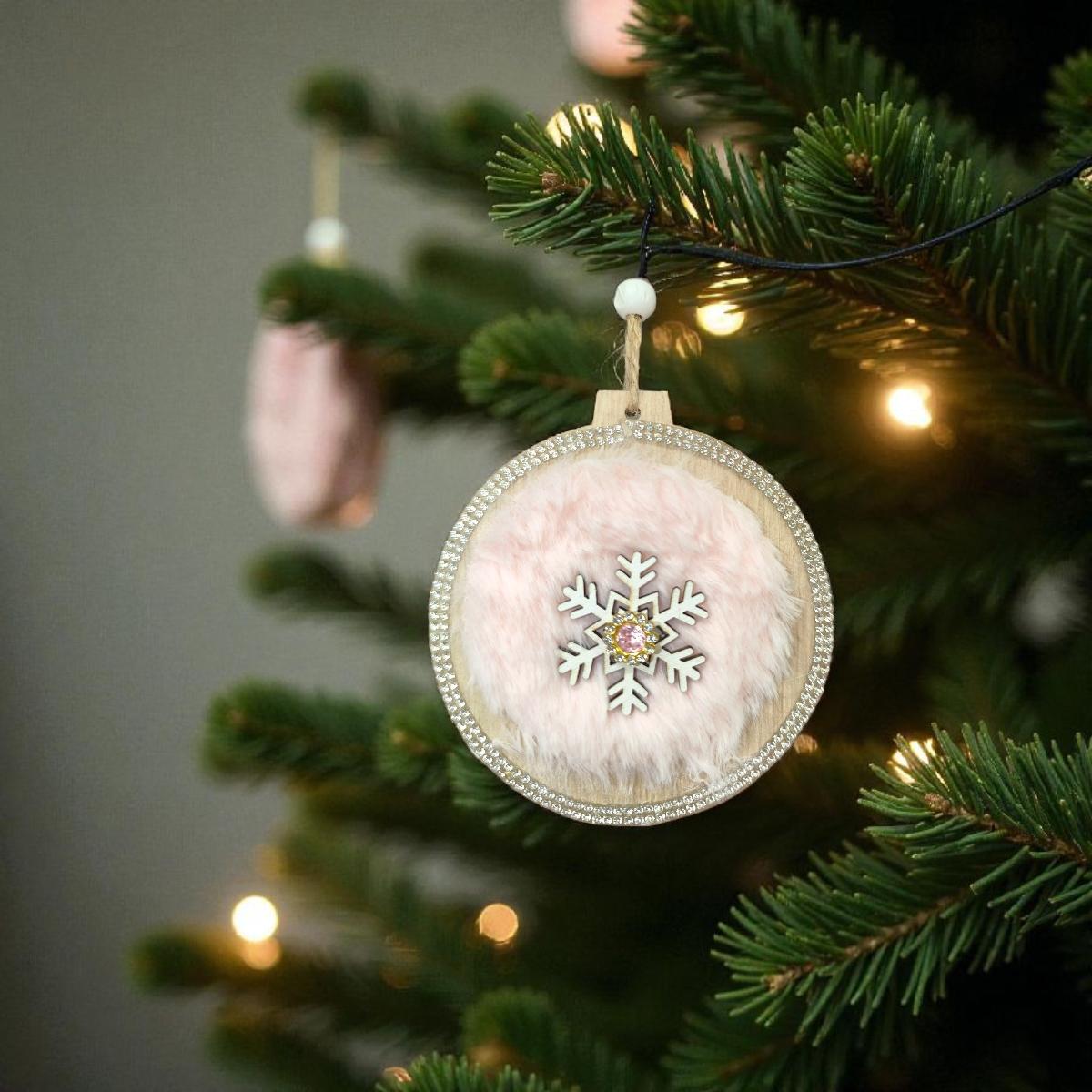 Természetes hatású, fából készült karácsonyfadísz fonott gömb formában, strasszos hópehellyel és rózsaszín szőrmedísszel. A zsinór fa gyöngyökkel díszített, ami elegáns és meghitt hangulatot kölcsönöz a karácsonyfának. Tökéletes választás a természetes, mégis stílusos ünnepi dekorációhoz.