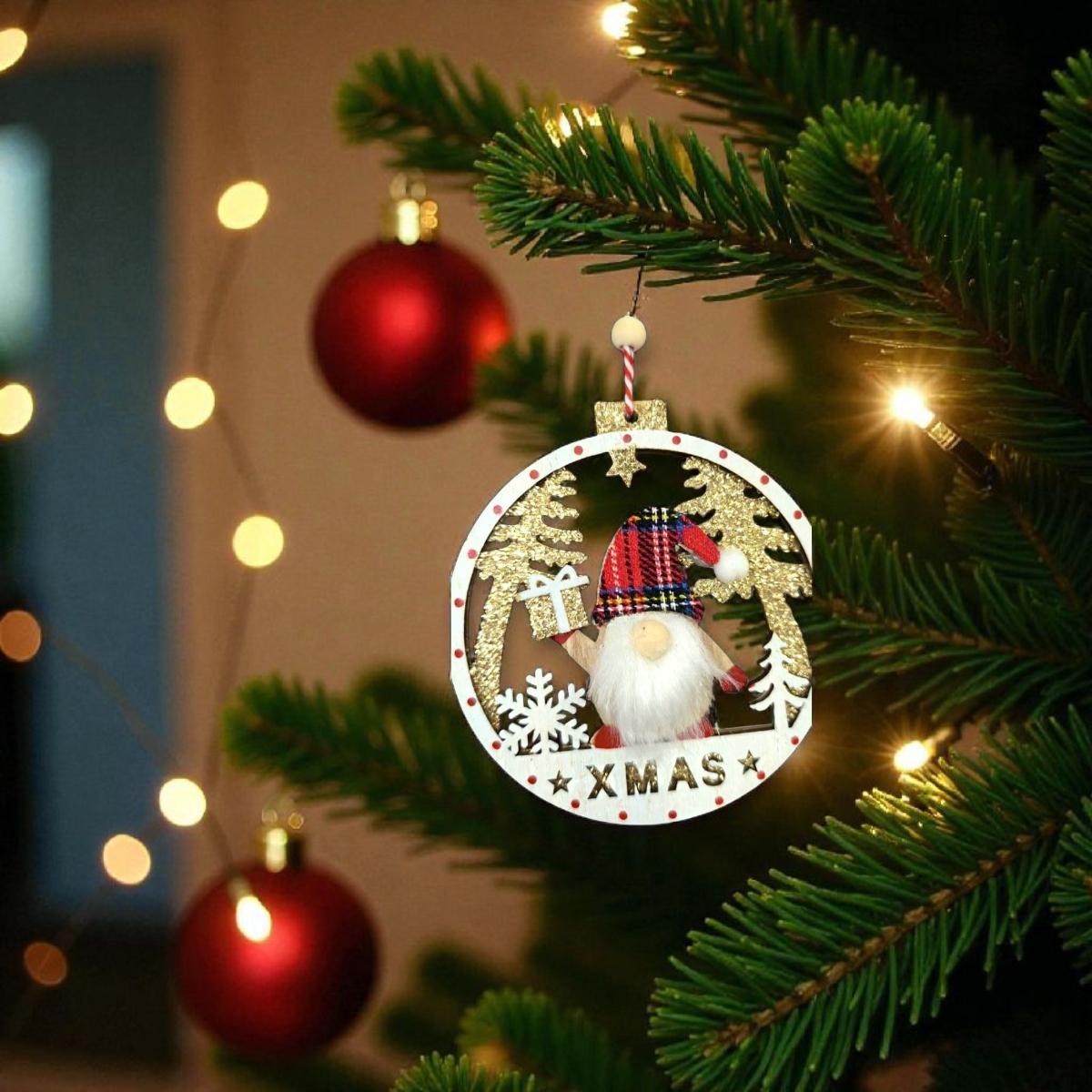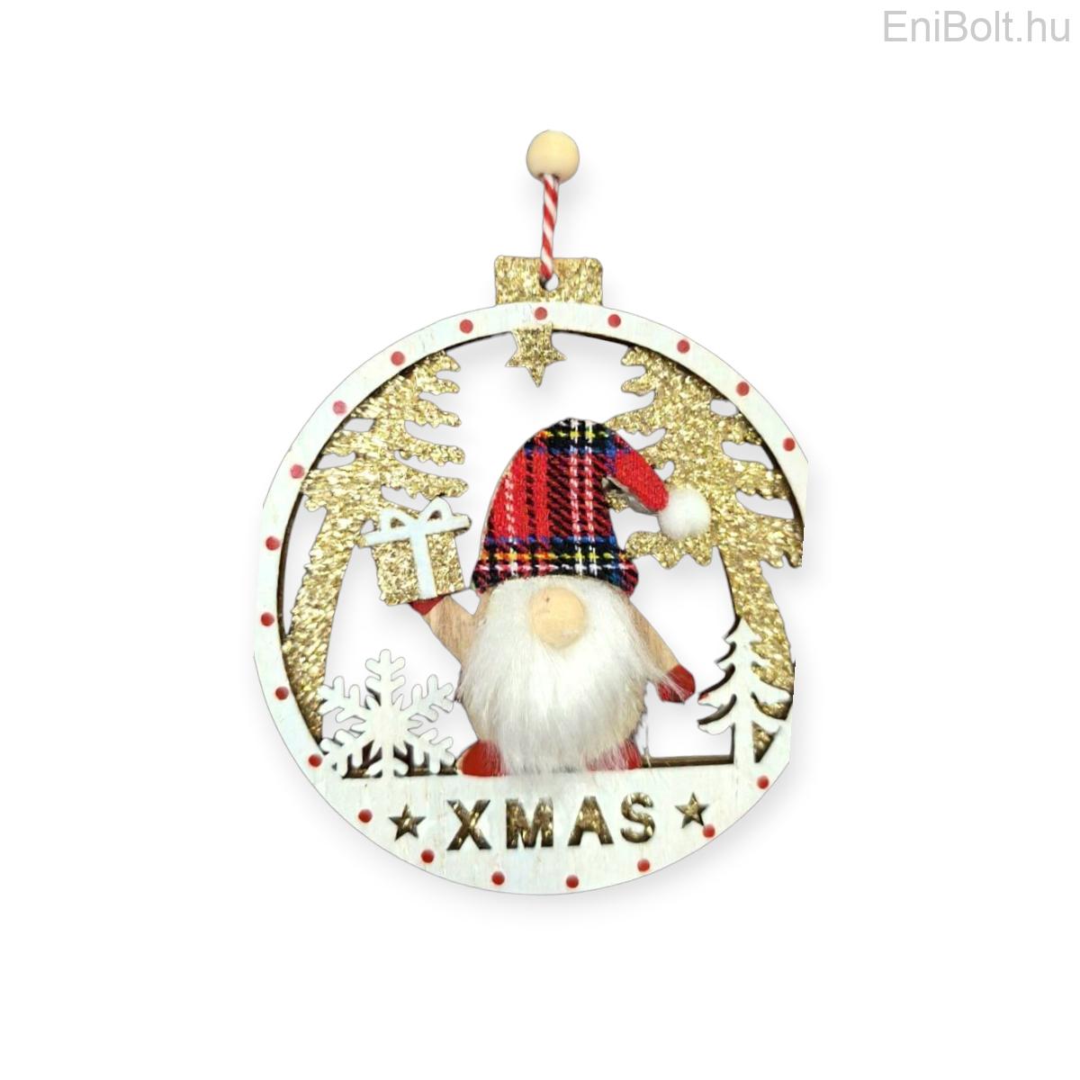 Fehér perforált fa gömb karácsonyfadísz gnóm figurával, kockás kalappal és hosszú szakállal. A pezsgő bézs csillámos részletek és a „XMAS” felirat ünnepi hangulatot kölcsönöznek a karácsonyfának, vidám és egyedi dekoráció minden otthonba.