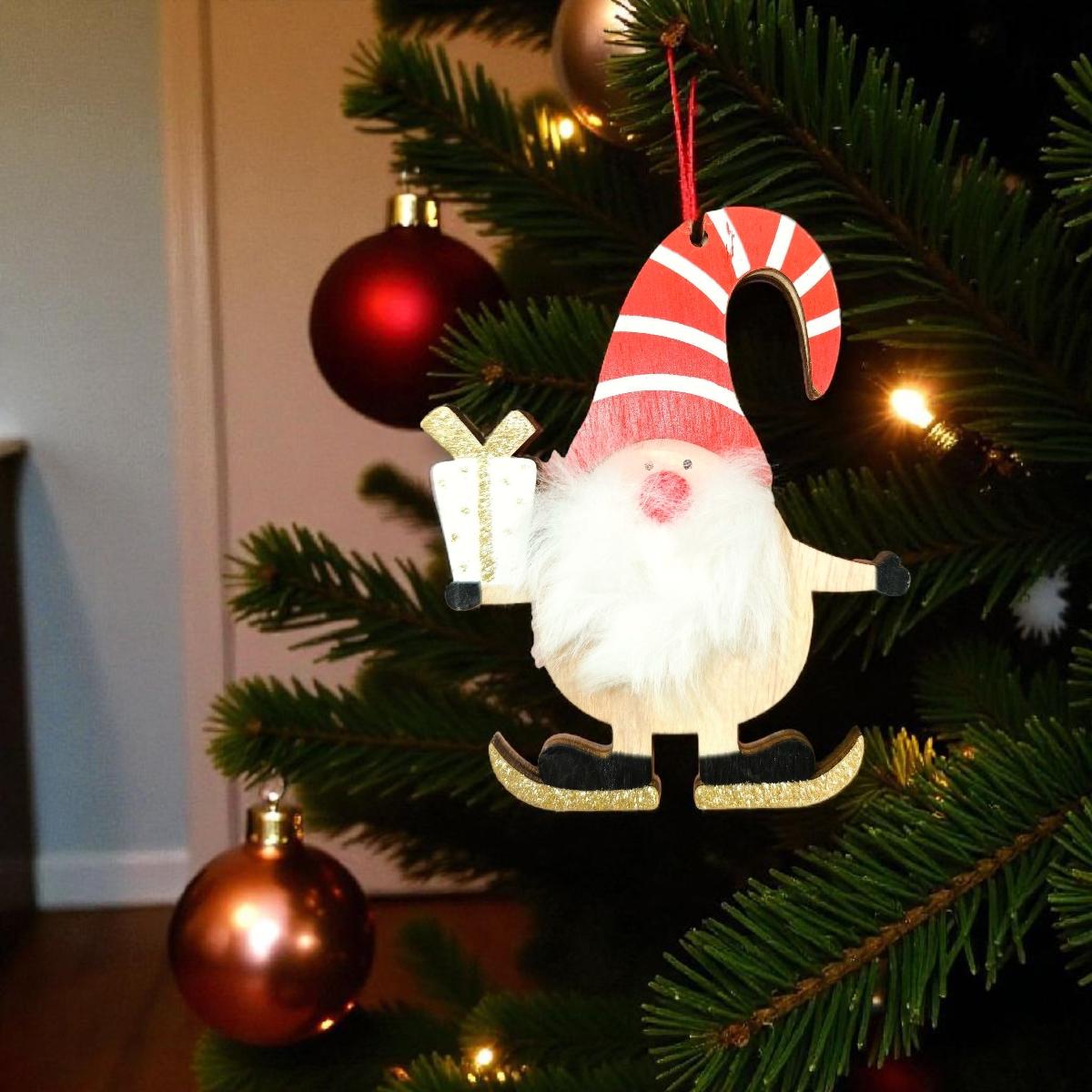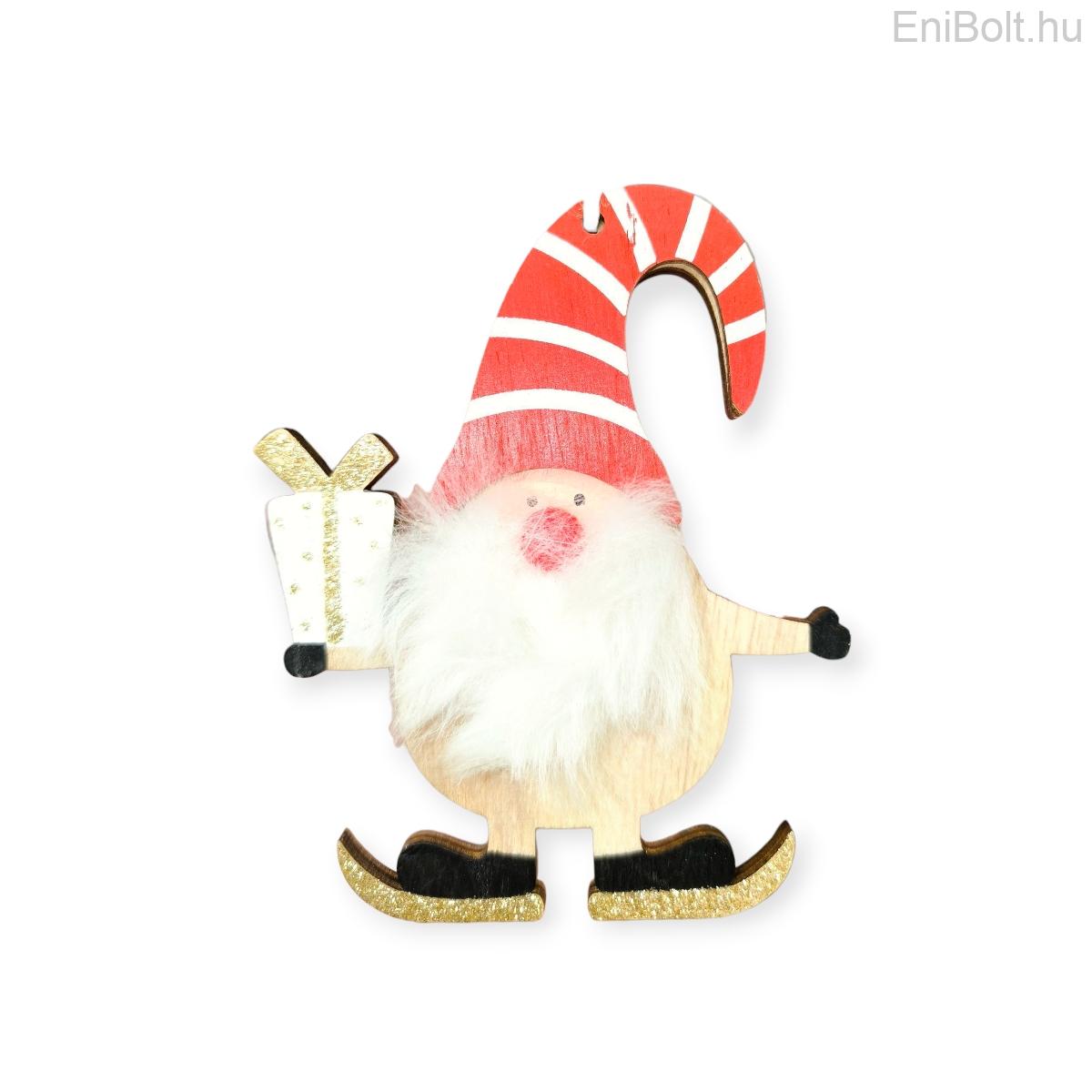 Ez a 12 cm-es fa karácsonyfadísz egy kedves gnóm figurát ábrázol piros csíkos sapkával és ajándékot tartó kezekkel. A csillogó részletek finoman emelik ki az ünnepi hangulatot, miközben a természetes fa alap meleg, rusztikus megjelenést kölcsönöz.