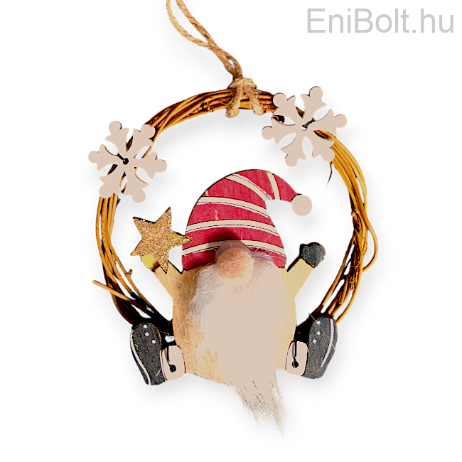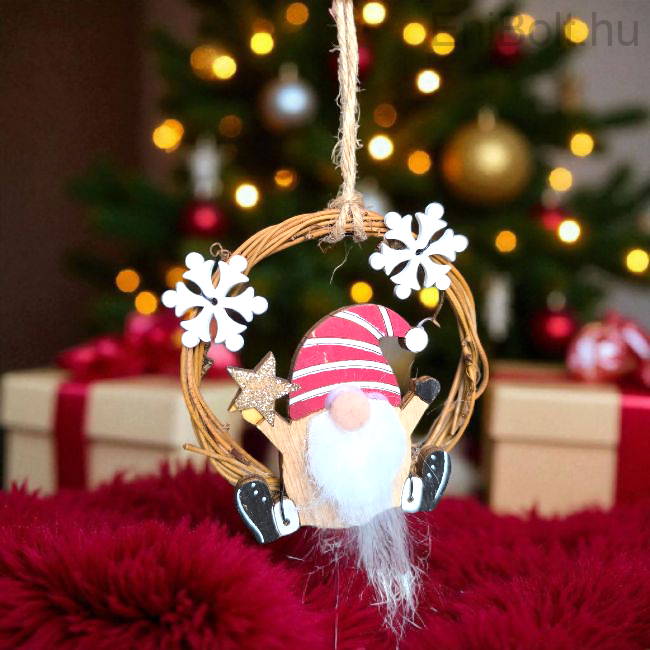 Kezdőlap » Karácsonyi dekorációk » Fából készült díszek » Fa karácsonyfadísz gnómmal és hópelyhekkel – csillogó koszorú, 8 cm