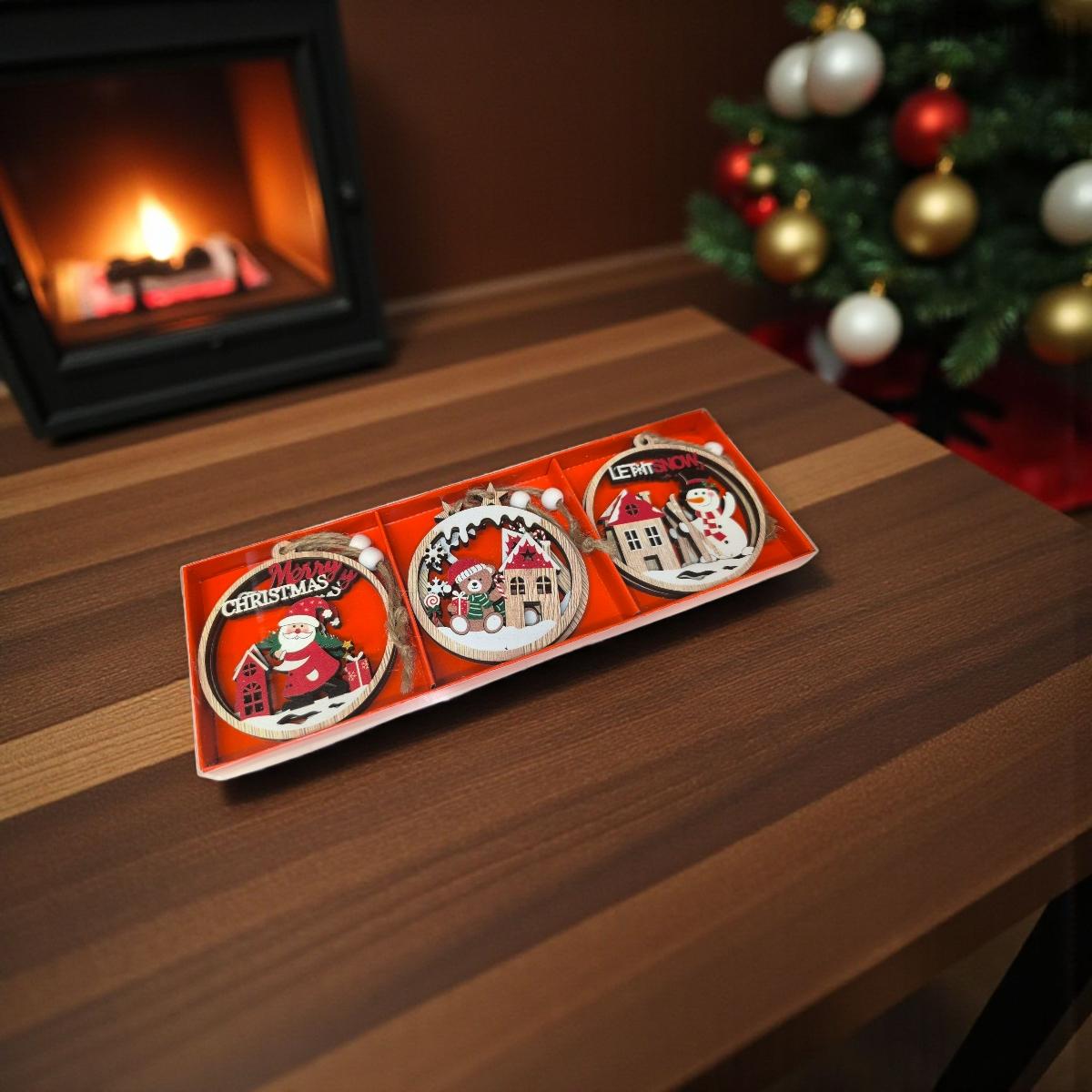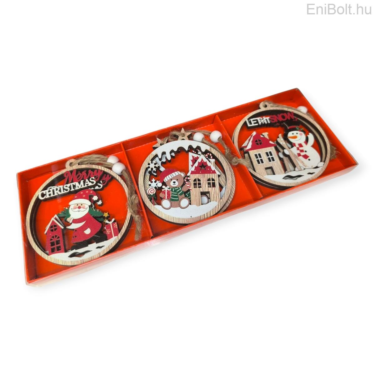 Fa karácsonyfadísz készlet – Mikulás, mackó és hóember motívumokkal, Ø8 cm (6 db)