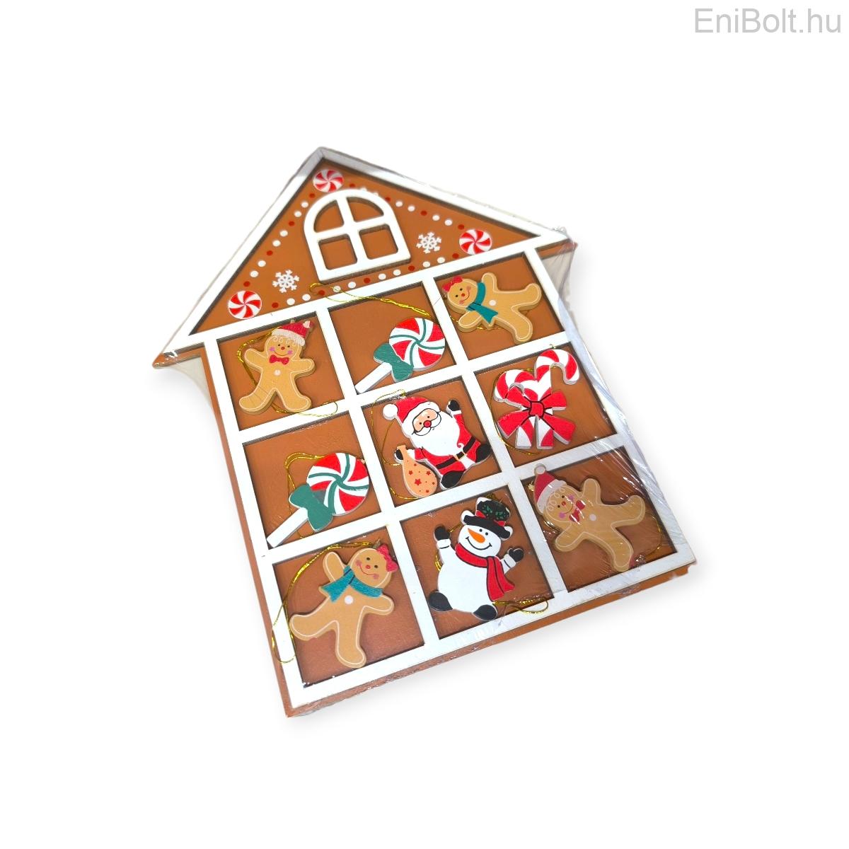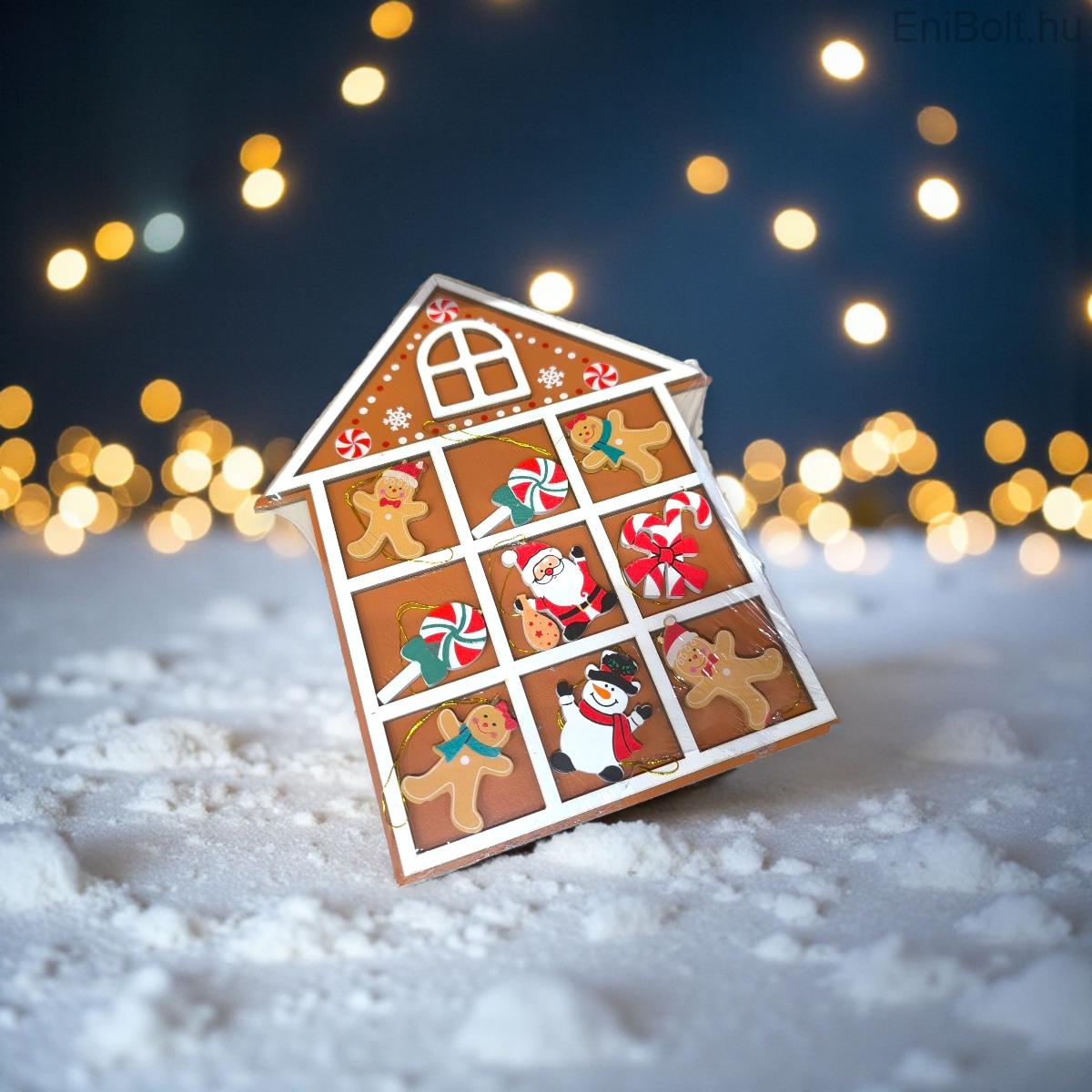 Bájos fa karácsonyfadísz szett 9 apró figurával: mézeskalács figurák, Mikulás, hóember és édesség motívumok egy hangulatos, ház alakú fadobozban. Vidám, mesés karakterek, amelyek életre keltik a karácsony varázsát. Tökéletes a karácsonyfára vagy ünnepi asztaldísz mellé.