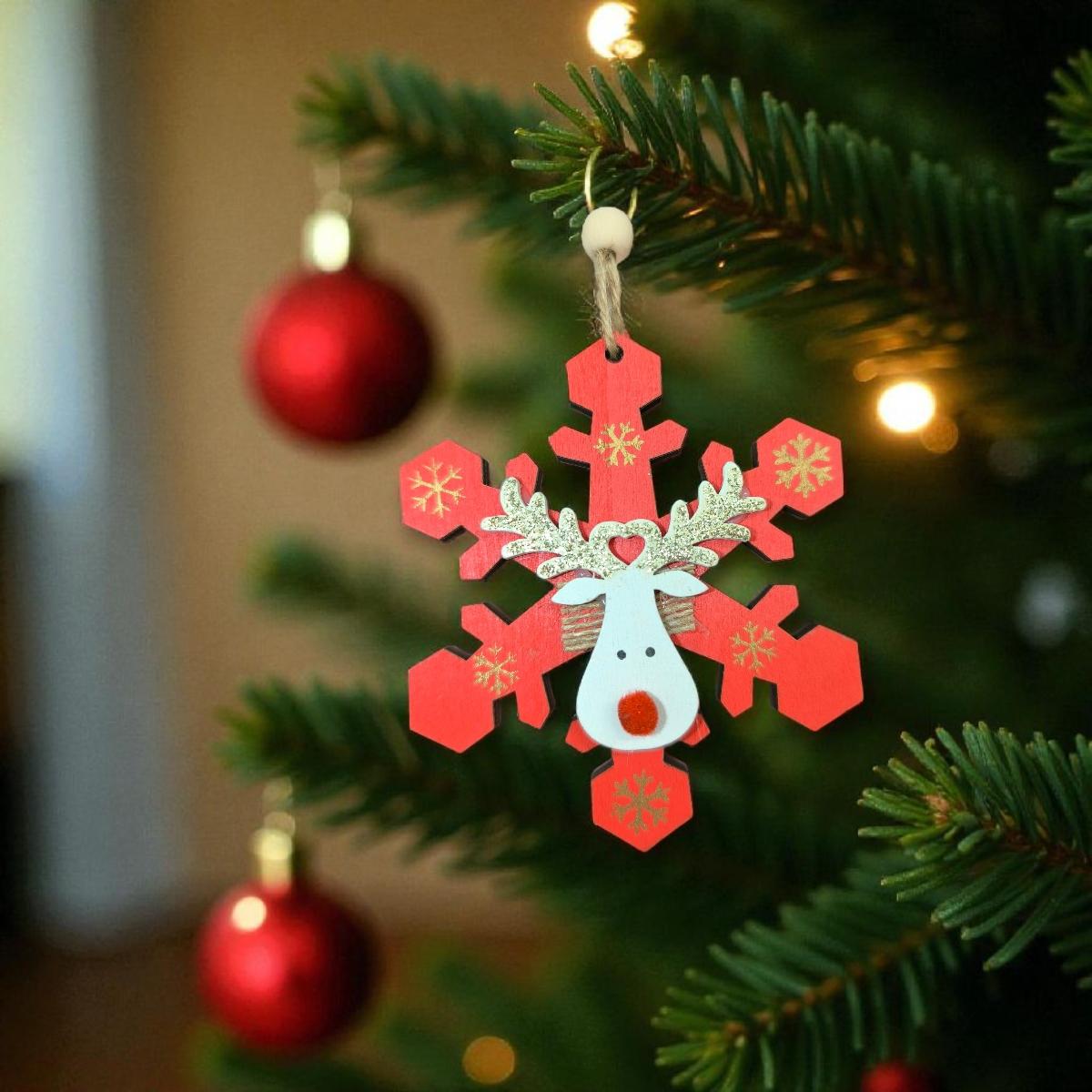 Természetes hatású fa karácsonyfadísz piros hópehely formában, közepén fehér szarvassal. Letisztult, mégis látványos kiegészítő, amely hangulatos, meleg karácsonyi összhatást teremt. Tökéletes hagyományos, skandináv vagy rusztikus dekorációkhoz.