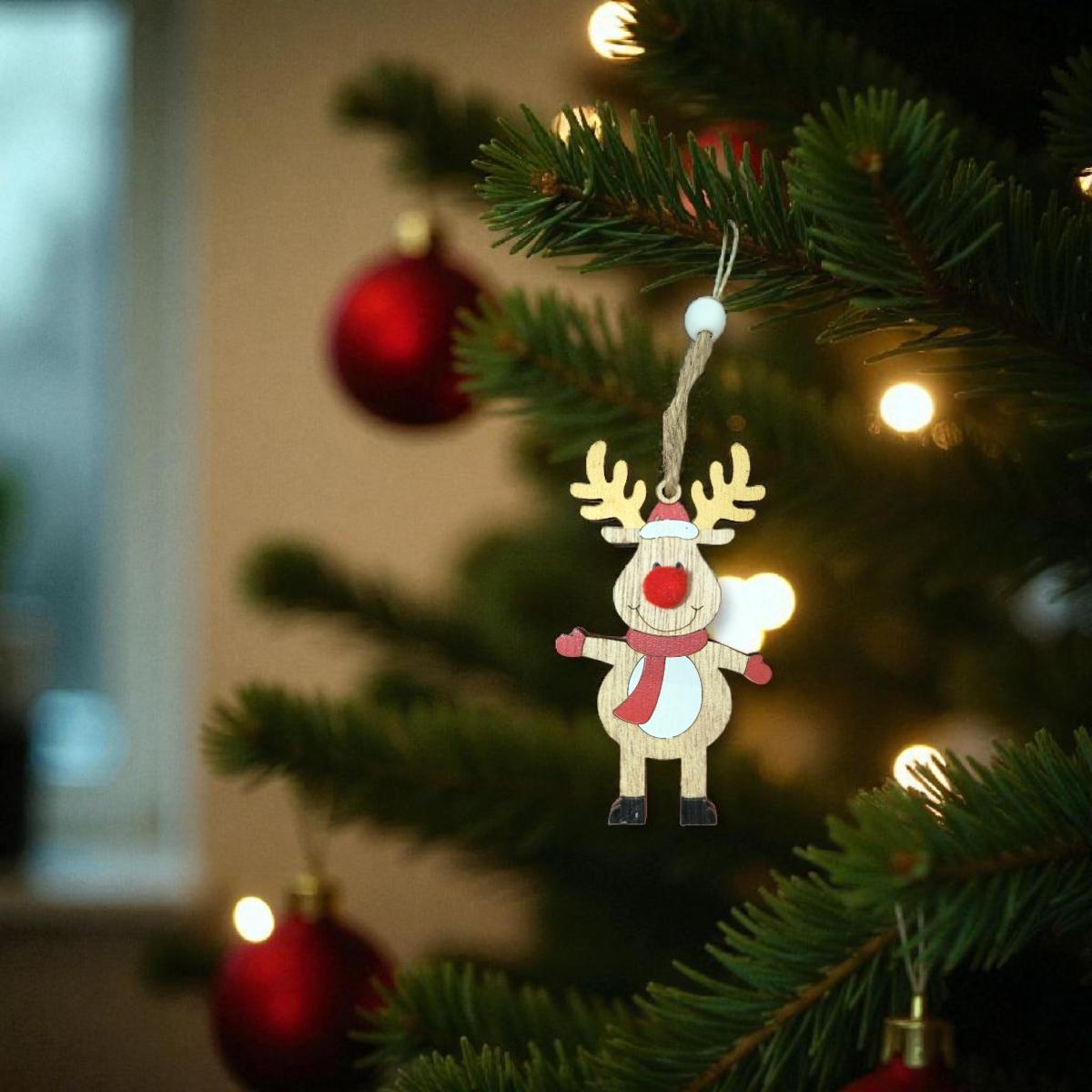 Aranyos, fából készült karácsonyfadísz szarvas figurával, piros pompon orral. Természetes, kedves megjelenése játékos hangulatot visz a karácsonyfára. Kiválóan illik rusztikus, skandináv vagy hagyományos ünnepi dekorációhoz.