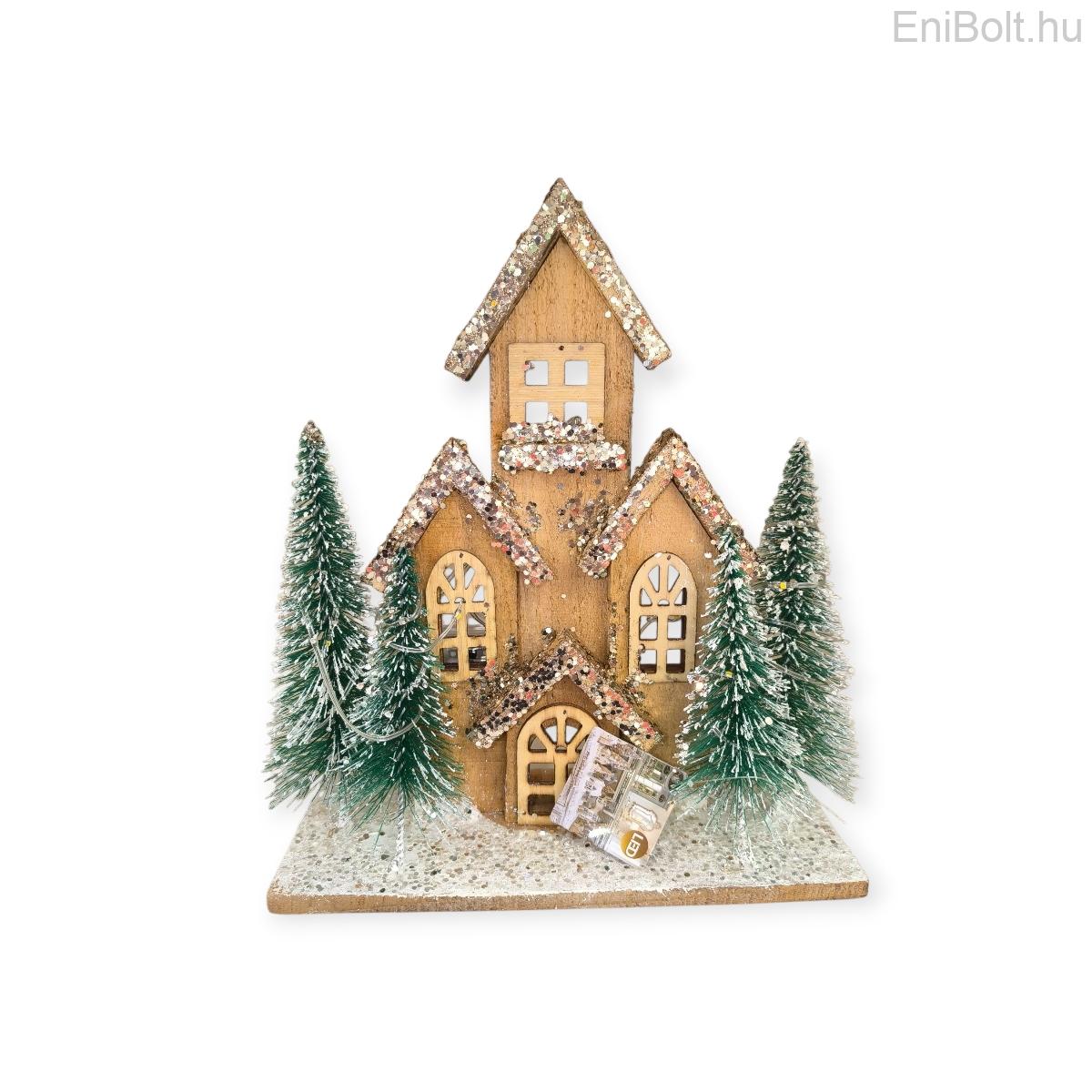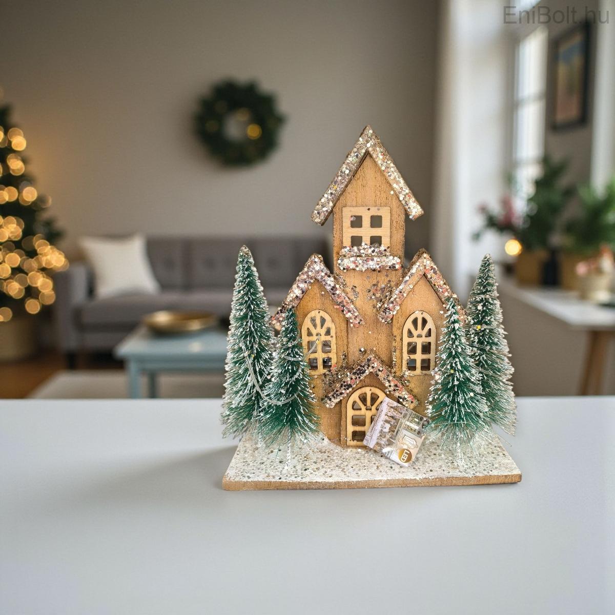 Kezdőlap » Karácsonyi dekorációk » Különleges díszek » Fából készült karácsonyi ház LED világítással és fenyőfákkal 29 cm