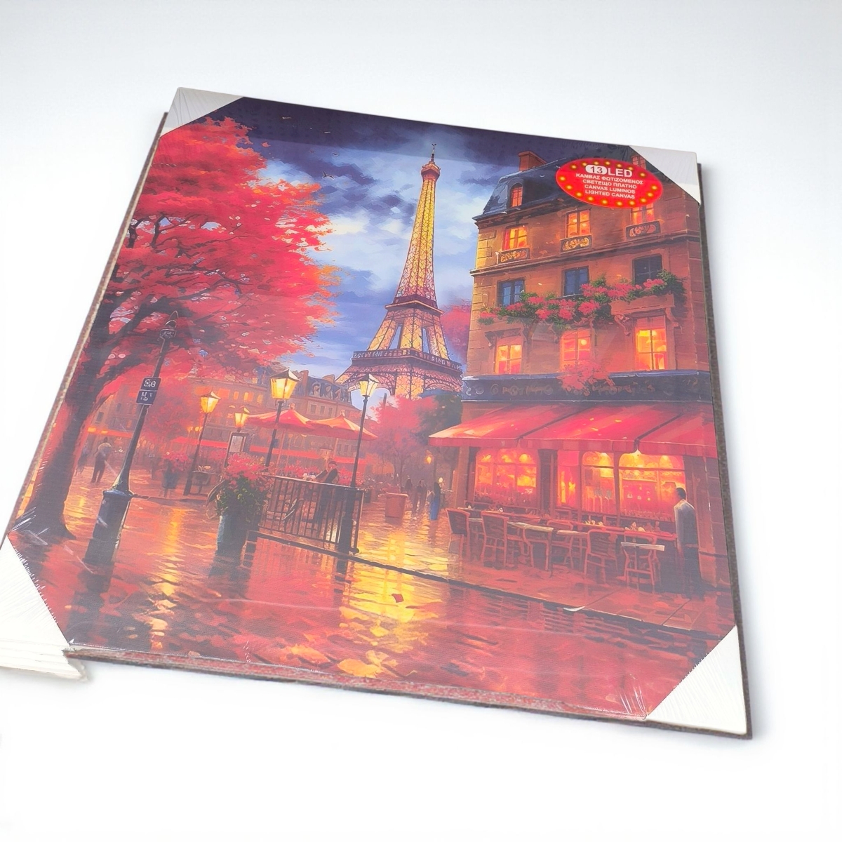 Elegáns LED-es fali kép, amely Párizs varázslatos látképét ábrázolja, az ikonikus Eiffel-toronnyal a háttérben. A beépített 14 LED izzó kellemes, meleg fényt áraszt, amely kiemeli a város romantikus hangulatát és egyedülálló stílust kölcsönöz otthonának.
