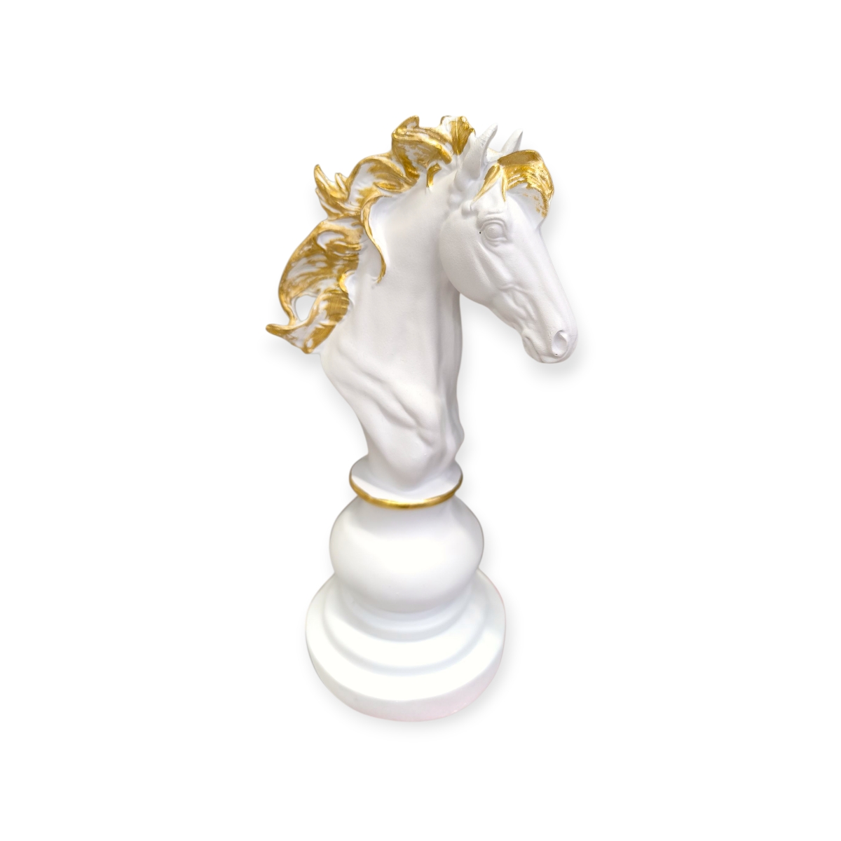 A fehér „ló” sakkfigura arany részletekkel stílusos kiegészítője lehet bármely nappalinak, irodának vagy polcnak. Letisztult formája és fényes arany díszítése modern eleganciát sugároz.