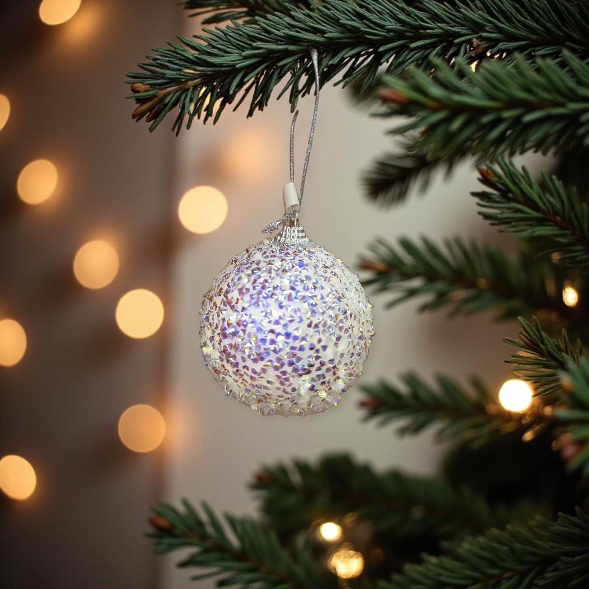 Különleges fehér habgömb karácsonyfadísz irizáló csillogó díszszálakkal, amelyek visszaverik a fényt, így a fa ragyogó és varázslatos megjelenést kap.